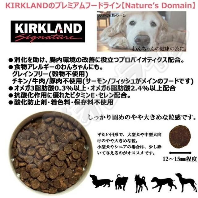 商品名: カークランド ネイチャーズドメイン サーモン・スイートポテト ドッグフード 成犬・子犬用 / Kirkland Signature Natures Domain Adult & Puppy dog Salmon, Potato
