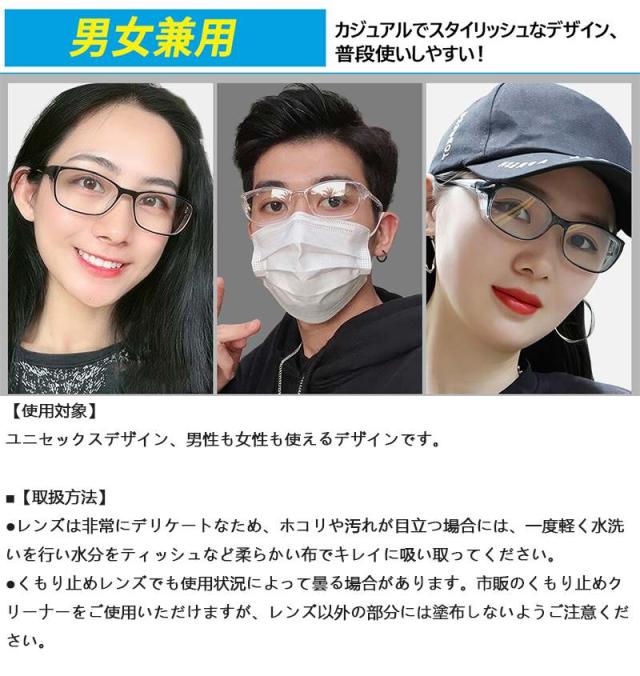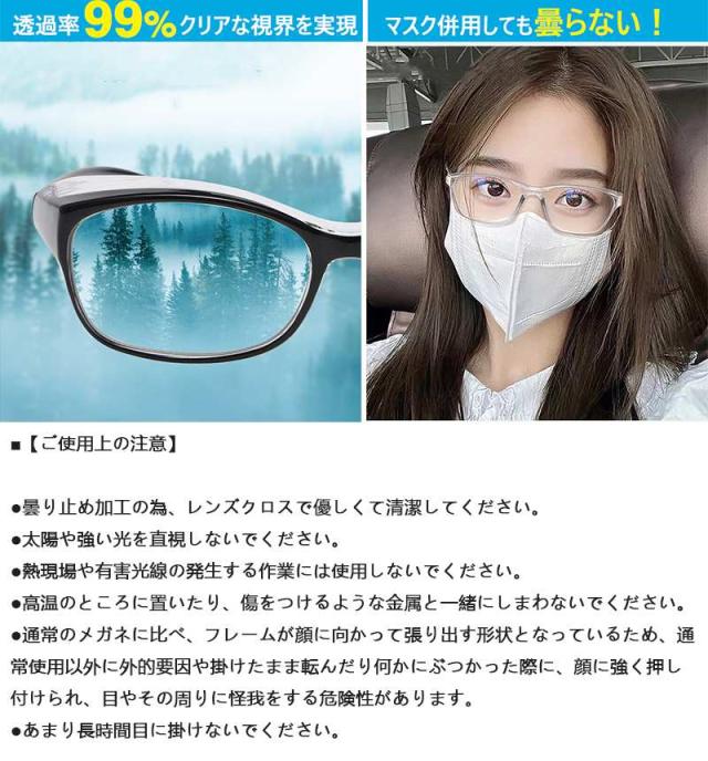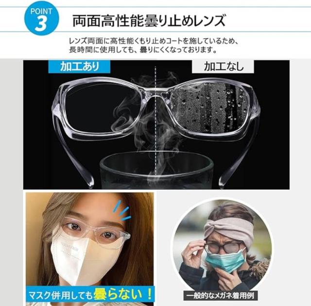 【レンズ両面高性能曇り止めコート】★PC製透明レンズ両面に、高性能くもり止めコートを施しているため、快適な視界を一日中確保できます。長時間に使用しても、曇りにくくなっております。曇り止め効果はとても良いです。 ※くもり止めレンズでも使用状況によって曇る場合があります。市販のくもり止めクリーナーをご使用いただけますが、レンズ以外の部分には塗布しないようご注意ください。
