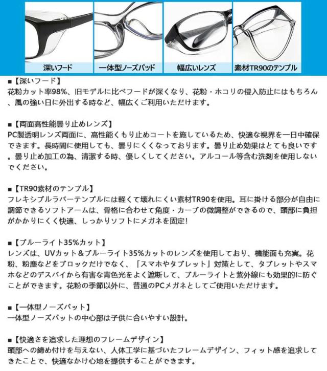 【大人用花粉症対策・防塵・保護メガネ】大人用に特別仕様でつくられた安全設計の「花粉対策めがね」です。花粉カット率:98% 旧モデルに比べフードが深くなり、花粉・ホコリの侵入防止にはもちろん、粉塵などが多い場所に適用、風の強い日に外出する時など、幅広くご利用いただけます。花粉によるアレルギーを起こしやすい人にお役に立つ一枚。黄砂などの粉じんもカット。また、花粉のみならず紫外線も99%カットするため、普段の紫外線対策にもご使用いただけます。立体構造のフレームが、顔にフィットして花粉をブロック!フィット感があって、使用後はまるごと水洗い出来ます。いつも清潔に保てます!【TR90素材のテンプル】フレキシブルラバーテンプルには軽くて壊れにくい素材TR90を使用。耳に掛ける部分が自由に調節できるソフトアームは、骨格に合わせて角度・カーブの微調整ができるので、頭部に負担がかかりにくく快適、しっかりソフトにメガネを固定!一体型ノーズパットの中心部は日本人に合いやすい設計。頭部への締め付けを与えない、人体工学に基づいたフレームデザイン、フィット感を追求してきたことで、快適なかけ心地を提供することができます。