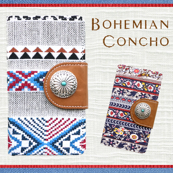 ミサンガをイメージした落ち着いた柄やチロリアンテープの様な可愛い柄のコンチョが付いた手帳型ケースになります!!