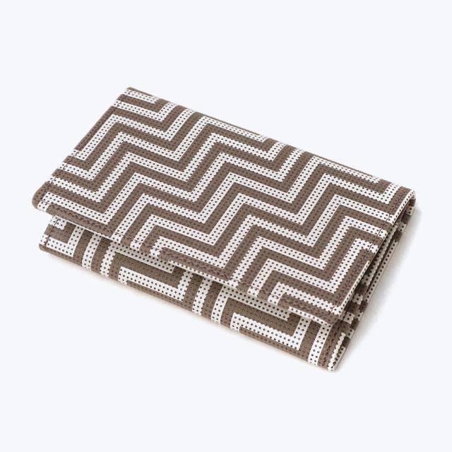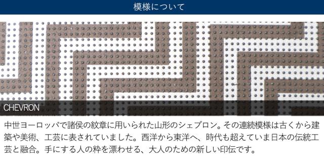 中世ヨーロッパで諸侯の紋章に用いられた山型のシェブロン。その連続模様は古くから建築や美術、工芸に表されました。西洋から東洋へ、時代も越えていま日本の伝統工芸と融合。手にする人の粋を漂わせる、大人のための新しい印伝の登場です。落ち着きのある色調で構成された幾何学模様のシェブロンは、オンオフ関わらず様々なスタイリングに調和しながら、大人の香気をほどよく添えます。