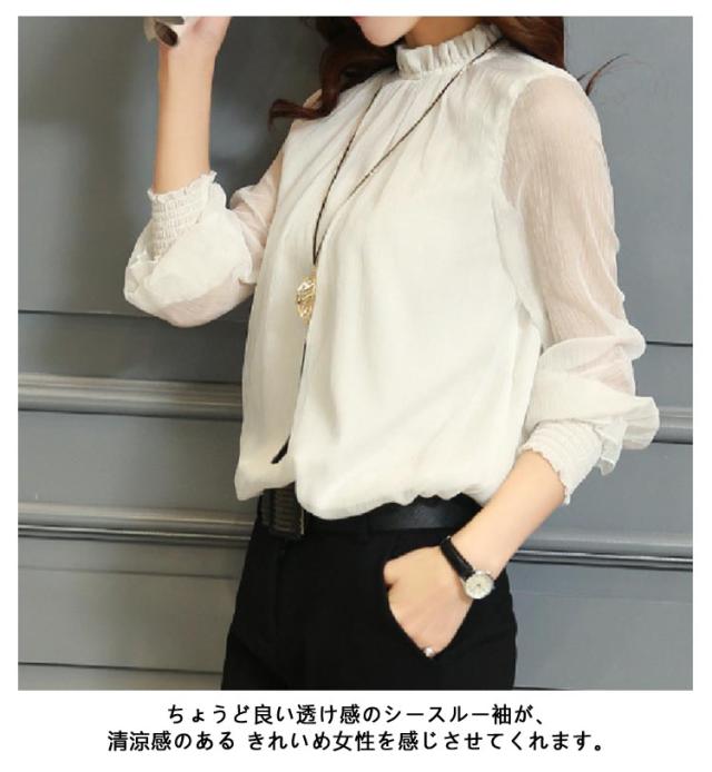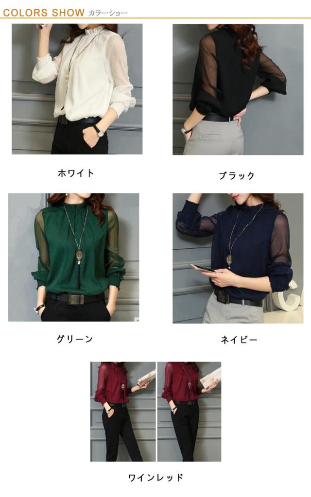 シフォン トップス ブラウス シースルー プチ ハイネック 長袖 シャツ トップス チュール インナー シアーシャツ とろみ 立ち襟 フリル スタンドカラー オフィス ビジネス フォーマル きれいめ ホワイト ブラック グリーン ネイビー ワインレッド