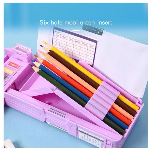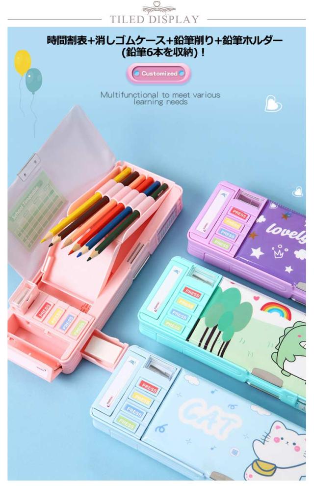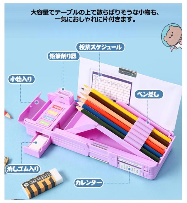| 全9色! 機能性はバッチリなので大活躍間違いなし。ペンケース。 時間割表+消しゴムケース+鉛筆削り+鉛筆ホルダー(鉛筆6本を収納)! 大容量でテーブルの上で散らばりそうな小物も、一気におしゃれに片付きます。 文房具が一目瞭然で、分かりやすく使いやすい! | |