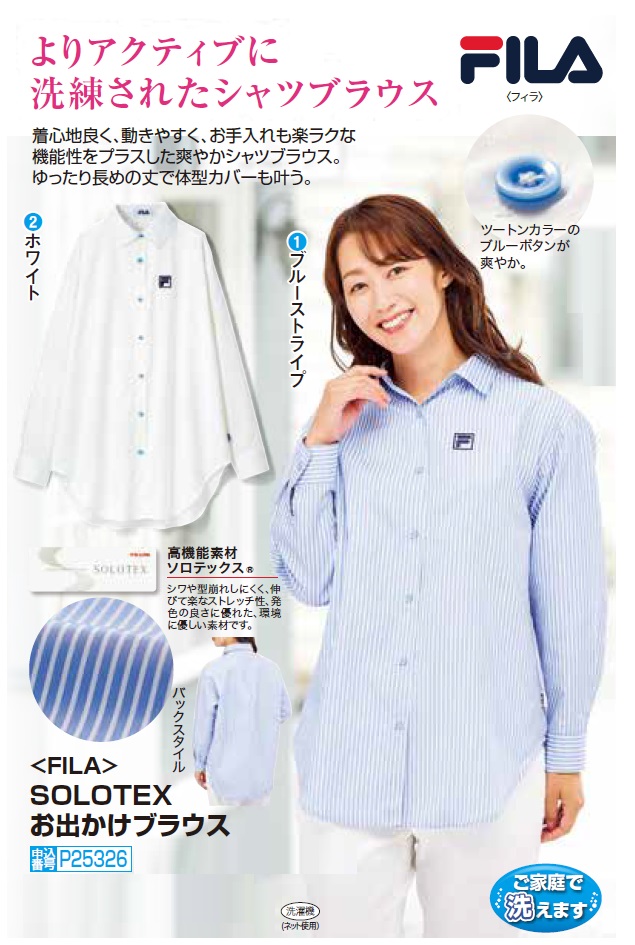 フィラ ソロテックス お出かけブラウス 全2色 ブラウス シャツ 長袖 ストライプ ホワイト レディース 婦人服 ミセス シニア 女性 大人 ブルー 白 青 縞模様 シンプル 上品 体型カバー シニアファッション 40代 50代 60代 70代 80代 母の日 お母さん 秋冬 fri p25326