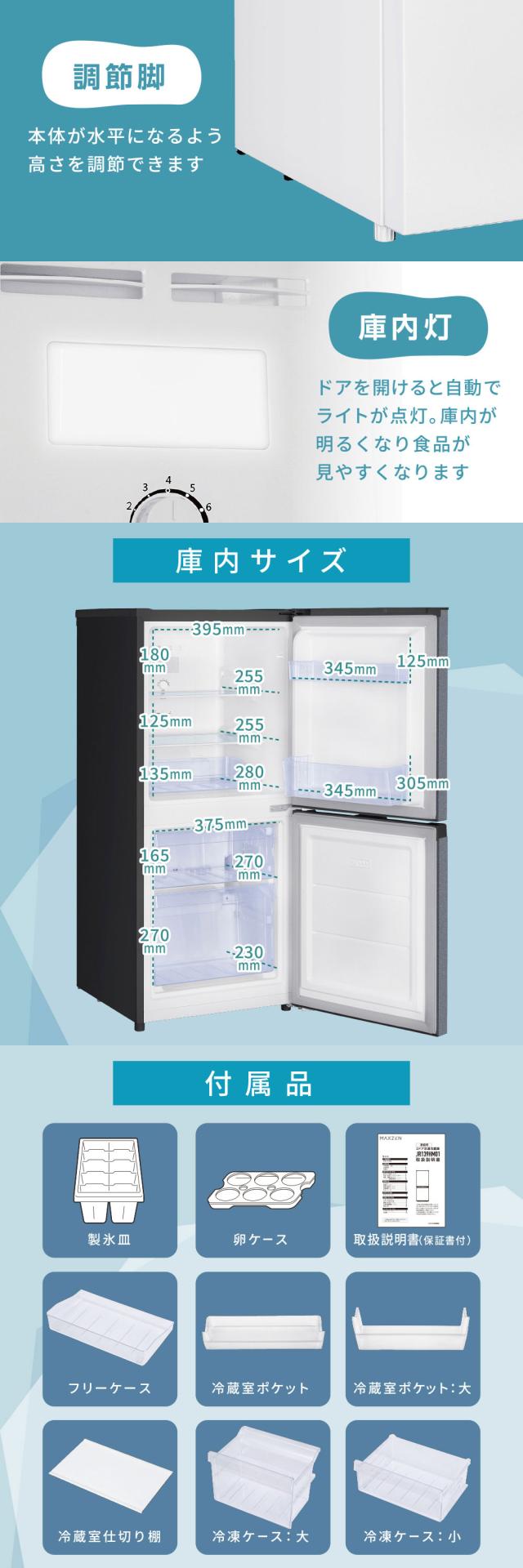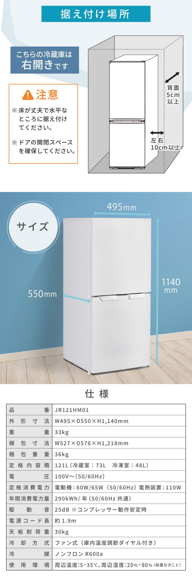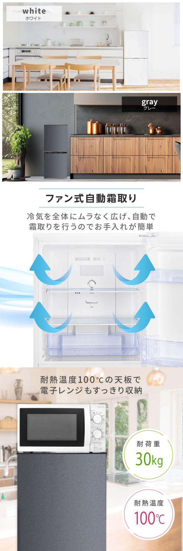 冷蔵庫 121L 自動霜取り コンパクト 大容量 右開き 2ドア 幅50cm 一人暮らし 二人暮らし 冷凍室下側 温度調節 耐熱板 省スペース 黒 グレー JR121HM01 マクスゼン