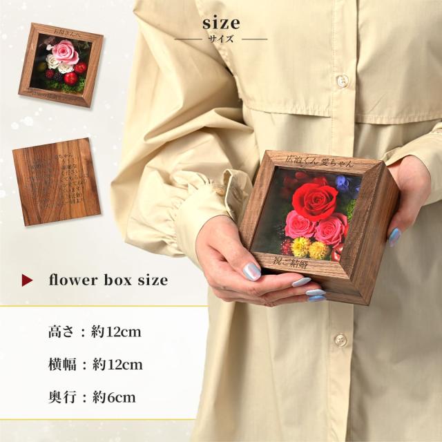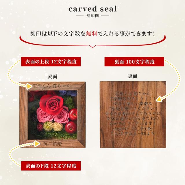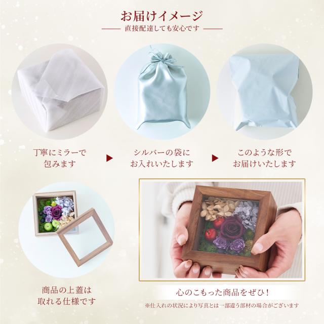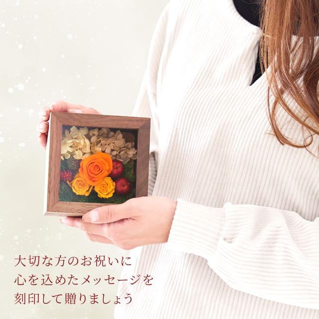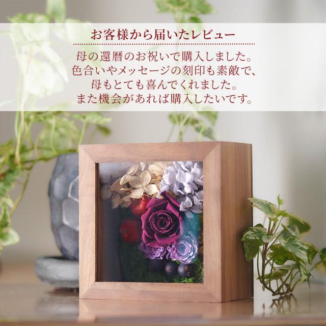 厳選した落ち着いたトーンの木箱にバラのプリザーブドフラワーや紫陽花、千日紅などキレイな花をコルクの上に敷き詰めました。 花言葉もあり、用途に応じてお贈りできるギフトになっております。 木箱の上部、下部、裏面にメッセージを刻印する事ができます。 ぜひ、大切な方の節目にお送り頂ければと存じます。 プリザーブドフラワーはハンドメイドで行っているので管理も行き届いております。 刻印もしっかりと対応をいたしますのでご安心してお買い求め頂ければと思います。 |