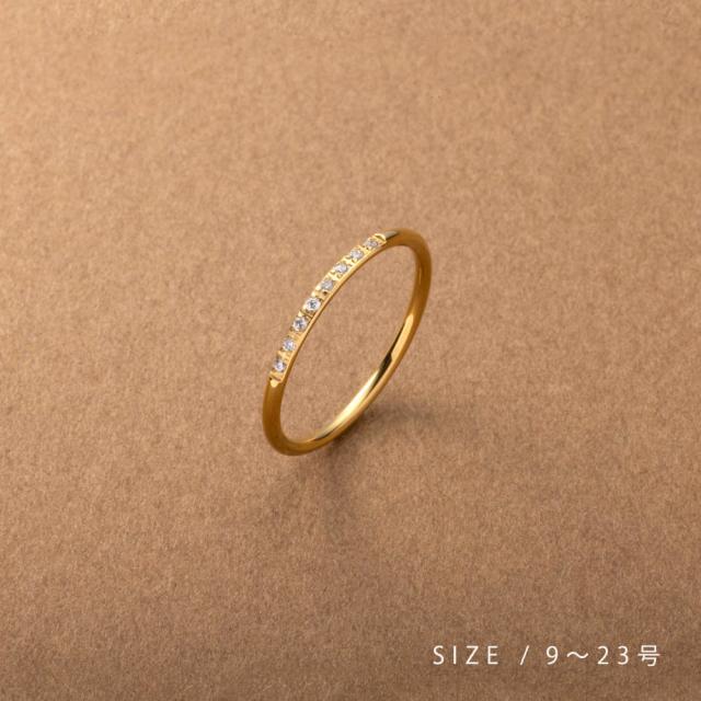 ビジューラインが輝くシンプルなステンレス製華奢リング。とっても華奢なリングラインに8粒のジルコニアが繊細に煌めく大人のためのスキンジュエリー。錆びにくいステンレス製でデイリーに活躍しそう◎
