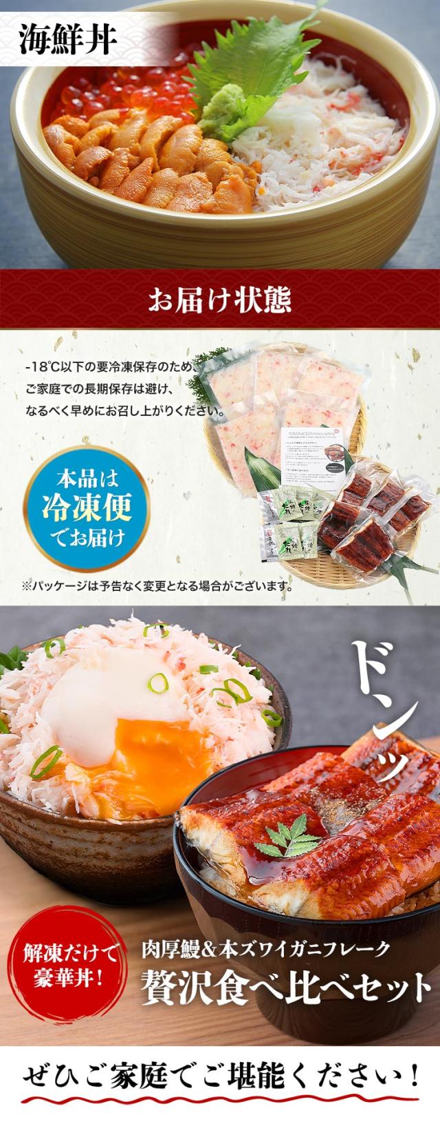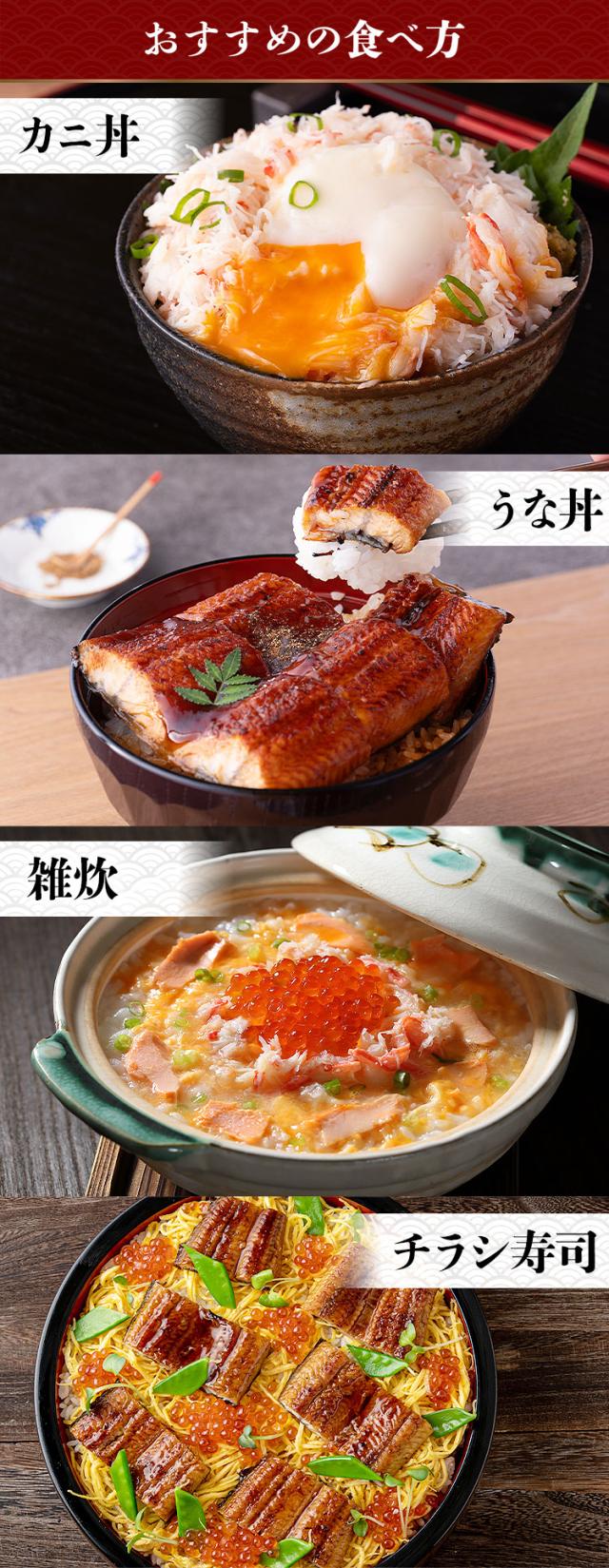 - 昨年初めて注文しました。うなぎは丼で食べて、かには、市販の「かに雑炊の素」に加えたら「贅沢かに雑炊」になったので、病みつきになり、あっと言う間に無くなりました。また注文したいと思います。