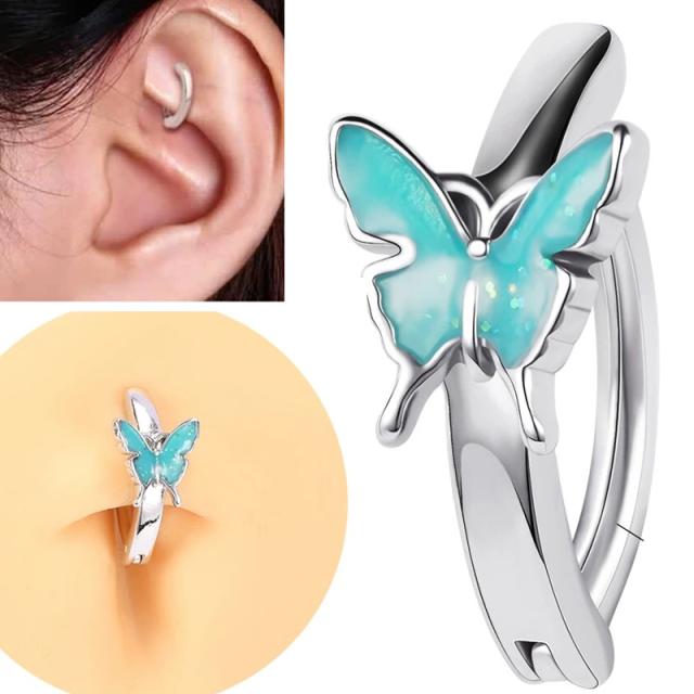青色ブルーのラメにエナメルコーとされた蝶々が綺麗な14ゲージのオーバルクリッカー型ボディピアス。