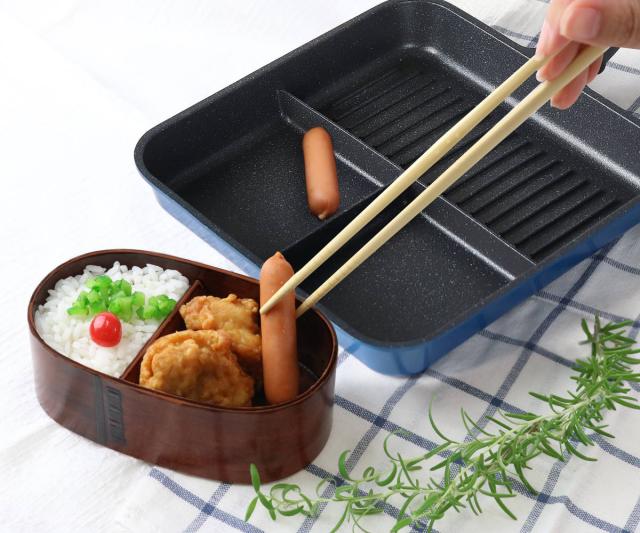 朝の忙しい時間でも同時に3種類のおかずが作れる、仕切りつきのフライパンです。調理の時短はもちろん、洗う手間も1回で済みます。ミニ玉子焼き、焼き魚、炒め物など、これひとつあれば一気にお弁当おかずや朝食のおかずが作れちゃいます。
