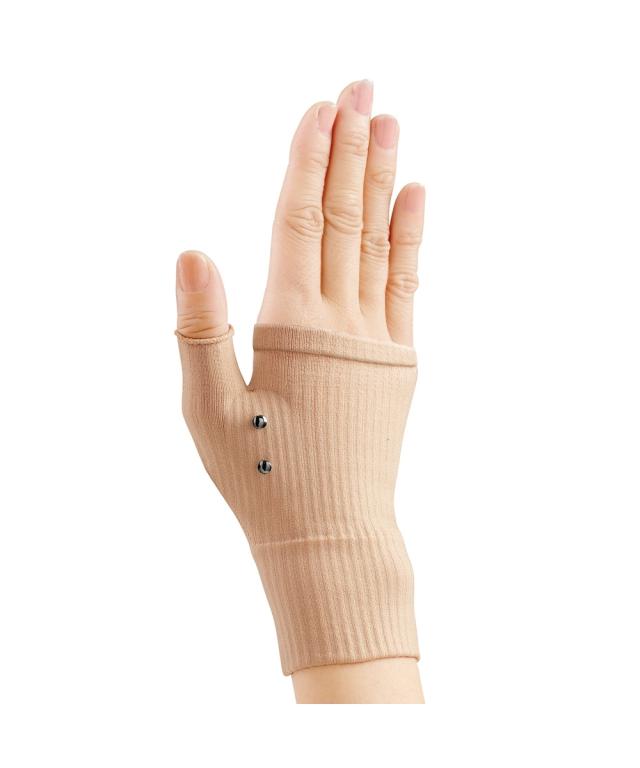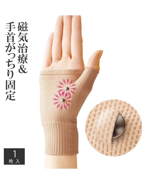 磁気治療&手首がっちり固定 血行の改善・コリをほぐす磁気の力 表裏4つの磁石が手の平を挟み込むように治療します。 テーピング効果で手首らくらく がっちり安定 手の平周りをがっちりと固定します。