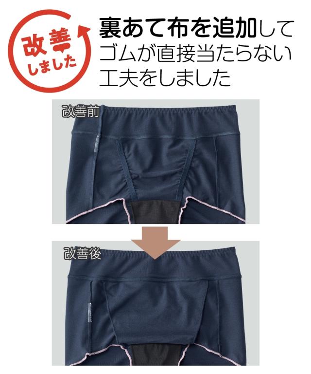 ■お客様のお声から改善しました 「お腹部分のゴムが肌にあたって不快」のお声から裏あて布を追加して、ゴムが直接あたらないよう改善しました! ■脚口はゴムなしで締め付けなし デリケートな時期こそやさしい仕様で快適に ■前に2本と、お尻のギャザーでナプキンのズレ防止 ■おへそまですっぽり(※)の深ばきタイプ はきこみ丈が深めでぽっこりお腹も包みこんで安心感のあるはき心地。 ※はきこみ丈には個人差があります ■ウエストらくちん ウエストは生地を折返してあり、ゴムが直接あたらない。 締めつけないかららくち