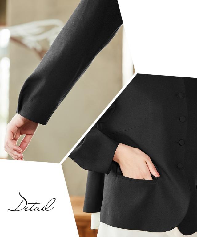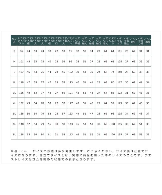 品質=[表地]ジャケット・パンツ:ポリエステル97%・ポリウレタン3%(織物)ブラウス:ポリエステル100%(織物) [裏地]有(ジャケット:総裏 ブラウス・パンツ:無) ジャケット:肩パッド無 前ボタン開 ポケット前2 ブラウス:前ファスナー開 パンツ:前ファスナー内ホック開 ウエスト後ゴム入 ポケット両脇 ※この商品は3点同サイズのみで販売します。 <機能性:防しわ、ストレッチ(ジャケット・パンツのみ)> 原産国:中国製(企画デザインは日本) 洗濯表示:洗濯機OK ネット使用