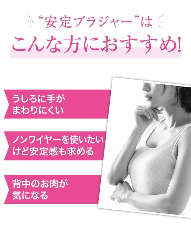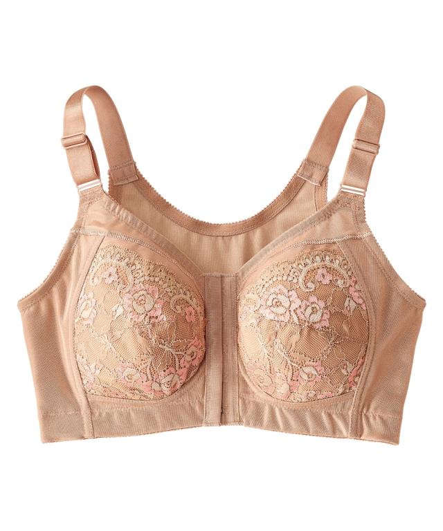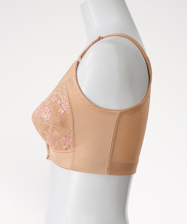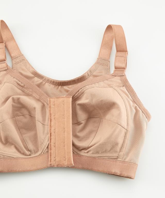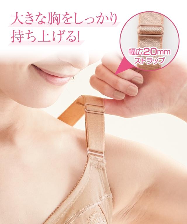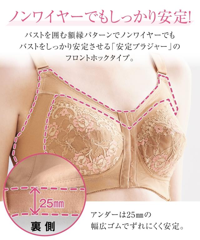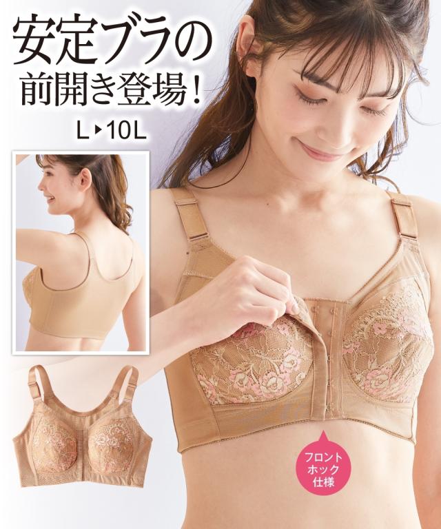 安定ブラにフロントホック登場 こだわりポイント ・バストを囲む額縁パターンでノンワイヤーでもバストをしっかり安定させる「安定ブラジャー」のフロントホックタイプ。 ・手が後ろにまわりにくい方も前開きで着脱ラク! ・フロントホックは、L〜5Lは5段2列、6L〜10Lは6段2列のホック仕様でかっちり安定。 ・大きな胸をしっかり持ち上げる幅20mmストラップ使用。 ・アンダーゴムは幅広25mmでしっかり安定。 ・額縁形状のブラなのでバストをすっぽり包み、脇肉流れも防止してハミ肉すっきり。 ・背中も幅広くカバーし