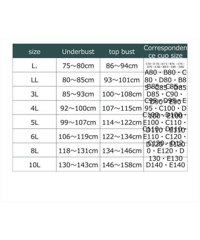 品質=ナイロン・ポリウレタン・その他 フルカップ ワイヤーなし フロントホック L〜5L:5段2列 6L〜10L:6段2列 ボーンなし パッドなし 柄が多少異なる場合があります。 原産国:中国製 洗濯表示:手洗い