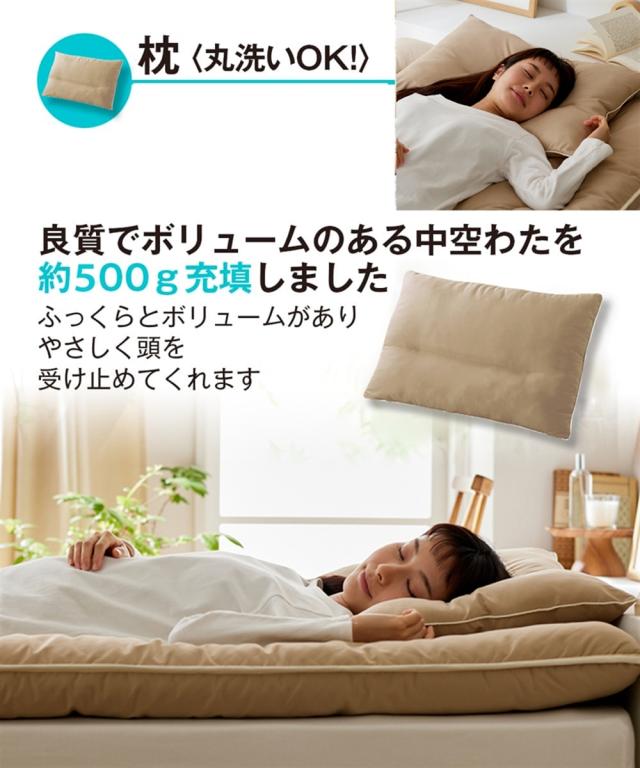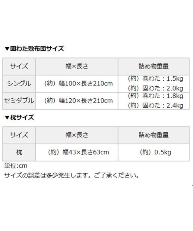 ●品質:側地=ポリエステル100%、詰め物=掛布団・ソフト敷布団・枕=ポリエステル100% ●掛布団=カバー留め付 ※商品は圧縮した状態で梱包されています。(圧縮梱包は、掛け布団+枕、敷布団になります。) ※行政の指導でパッチテストが実施出来ないため、24ケ月未満の乳幼児は対象としておりません。 原産国:中国製 洗濯表示:手洗い(掛布団・ソフト敷布団)、洗濯機OK ネット使用(枕)