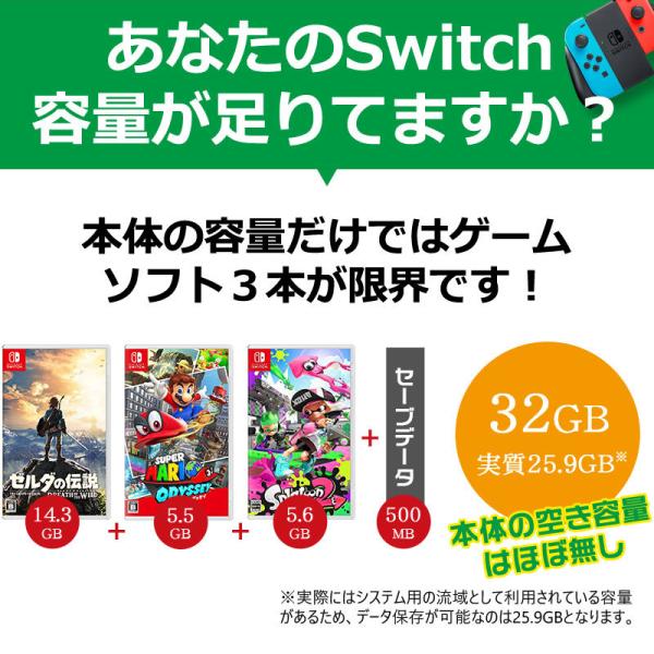※microSD カードを抜き差しは、必ずSwitch本体の電源をOFFにしてから行ってください。 【Switchをご利用の方、ご注意ください】microSD カードを抜き差しは、必ずSwitch本体の電源をOFFにしてから行ってください。 ご注意:本製品は「Nintendo Switch 2」には対応しておりません。あらかじめご確認の上、ご購入ください。 ※商品パッケージの表示容量は1ギガバイト を1,000,000,000バイトとして定義します。実際利用容量はオペレーティングシステムに1ギガバイトを1,073,741,824バイトとして定義しています。またメモリ容量の一部を管理領域として使用しているため、ご使用いただけるメモリ容量は商品の表示容量より小さいです。 ※浸水・破損・加工された場合は保証対象外となります。 |