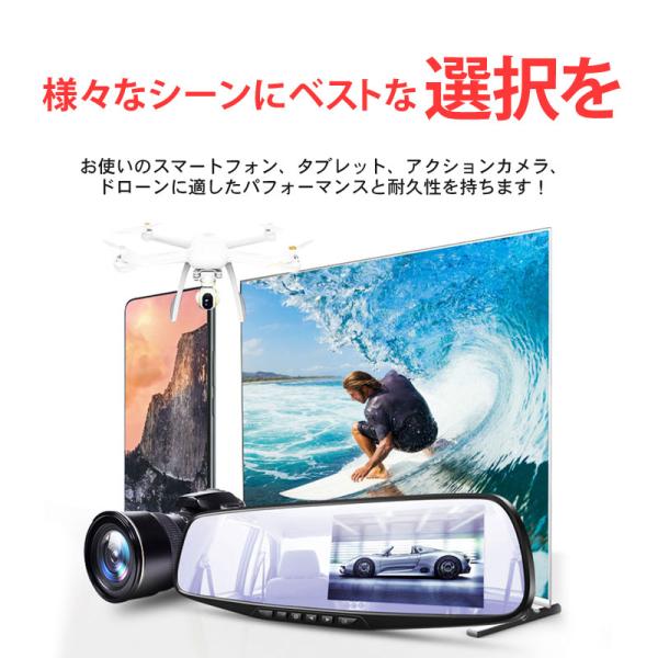 | 動作環境 | ファイルシステムexFATに対応した、microSDXC対応機器でのみご使用ください。 SD規格における高速バスインターフェースの新規格UHS-I に対応しています。 UHS-I 対応機器でのみ、UHS-I モードで使用できます。 温度-25〜85℃、湿度30〜80%RH(結露しないこと) |