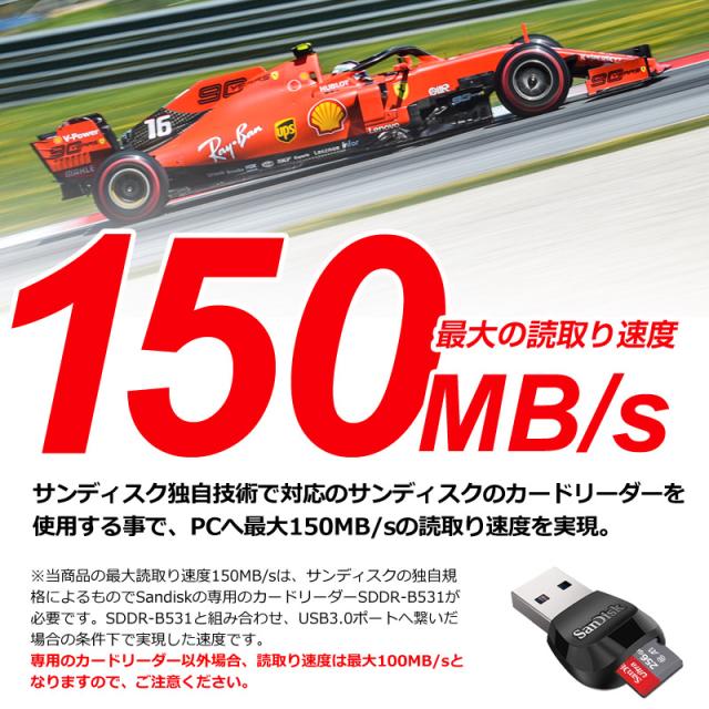 ※当商品の最大読取速度150MB/sは、サンディスクの独自規格によるものでSandiskの専用のカードリーダーSDDR-B531が必要です。SDDR-B531と組み合わせ、USB3.0ポートへ繋いだ場合の条件下で実現した速度です。専用のカードリーダー以外場合、読取速度は最大100MB/sとなりますので、ご注意ください。