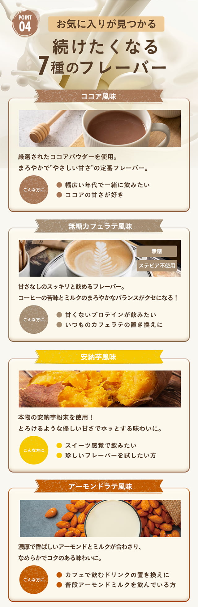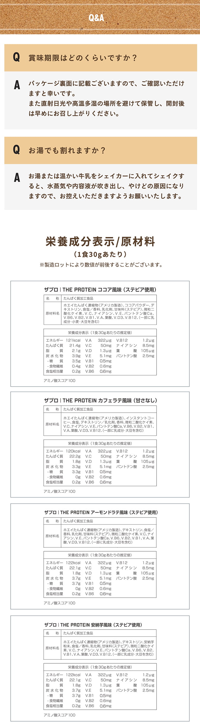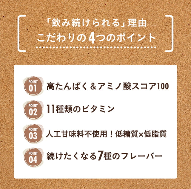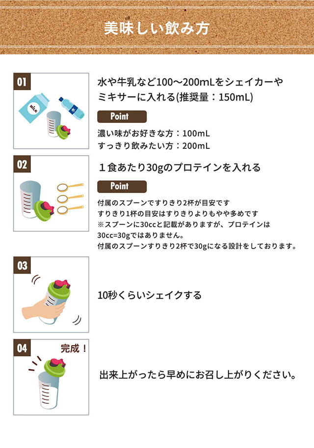 | 注意事項 | ・あけくちや袋の端で手を切るなどのケガをしないようにご注意ください。 ・熱湯や温かい牛乳をシェイカーに入れてシェイクしないでください。水蒸気や内容液がふき出し、やけどの原因になります。 ・体調や健康状態によっては体に合わないことがあります。その場合は摂取を中止し、医師や専門家にご相談ください。 ・開封後は水やホコリ、髪の毛が入らないようにチャックをしっかりと閉め、直射日光や高温多湿の場所を避けて保存し、早めにお召し上がりください。 ・濡れたスプーンを袋の中に入れないでください。 ・製品中に濃い粒が見えることがあります。これは原料の一部で品質には問題ありません。 ・妊娠、授乳中およびお薬を服用中の方は、医師とご相談の上ご利用ください。 |