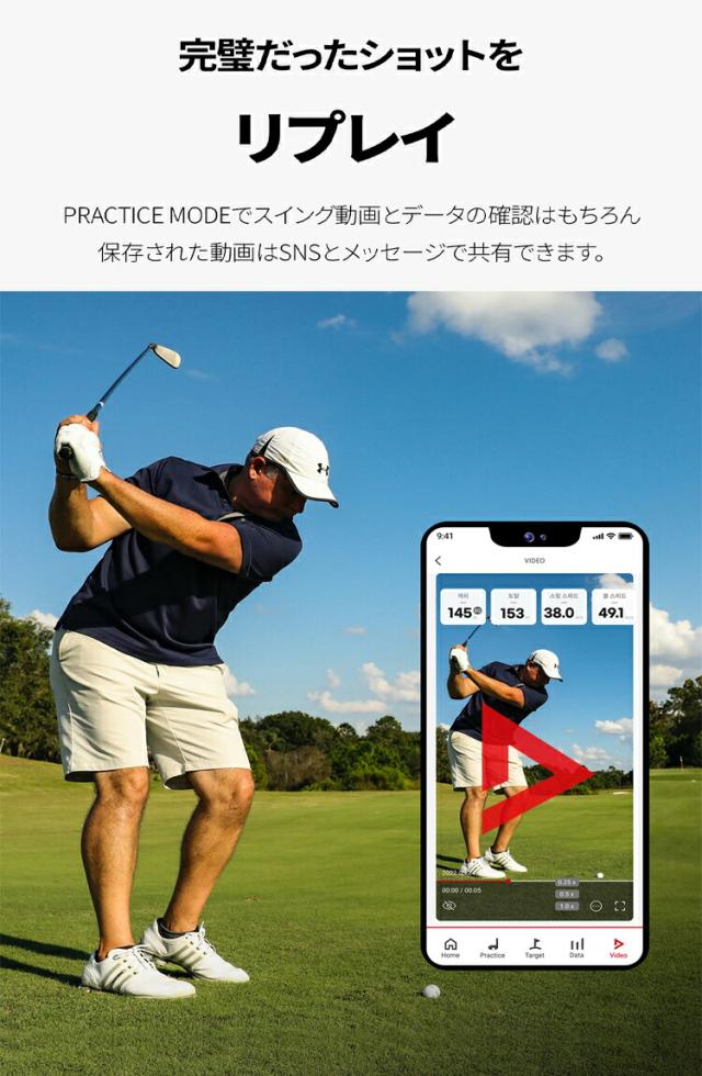 「MySwingCaddie」アプリをインストールすると、リアルタイムでショットを分析、ボールの弾道や統計、データの記録が出来ます。さらに、録画機能でスイングを映像で分析し、共有できます。