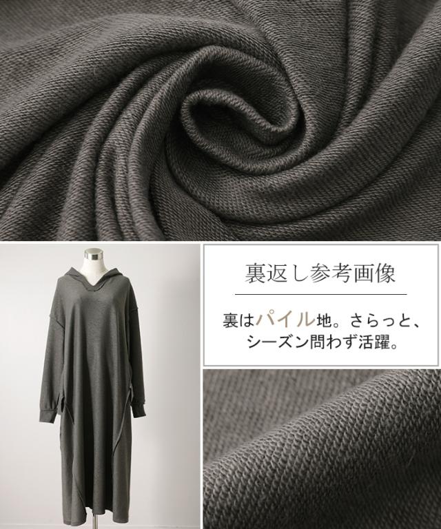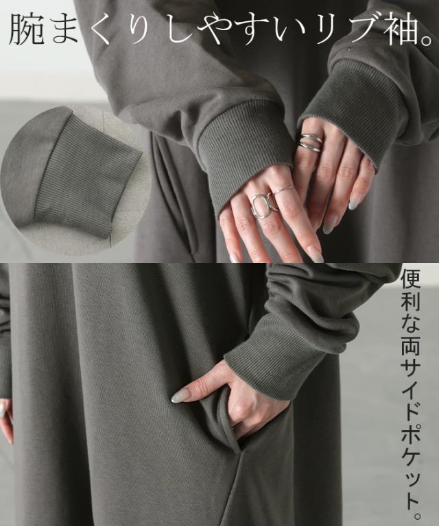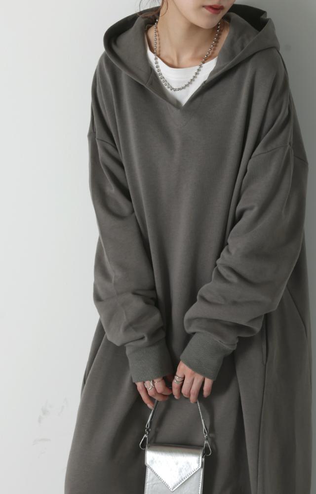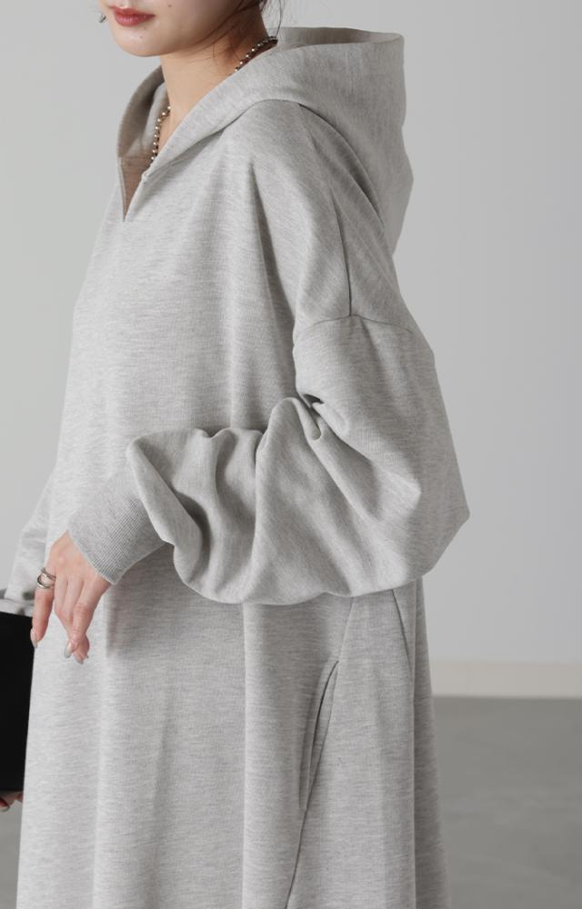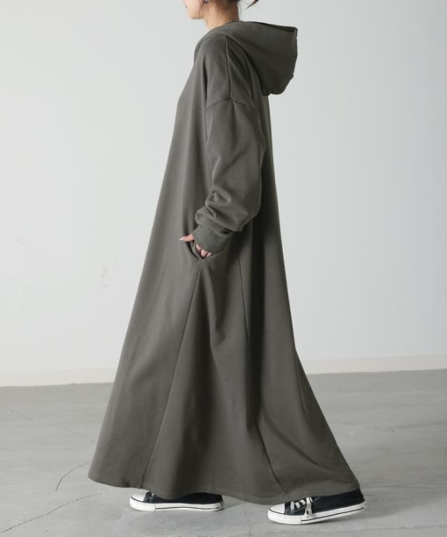 マキシ丈でポケット付きのスウェットパーカーワンピースです。