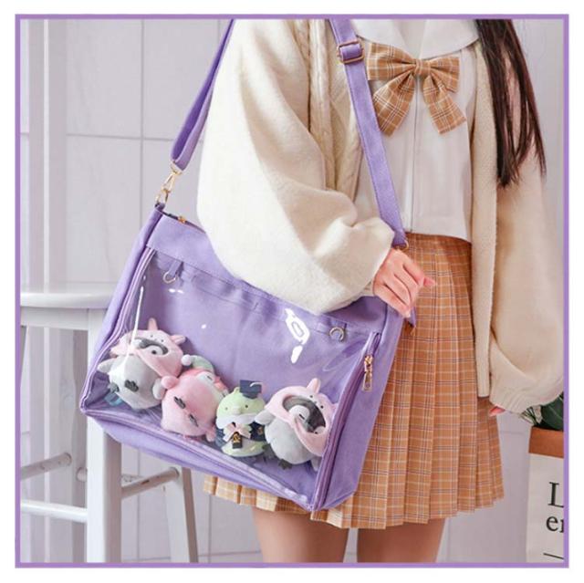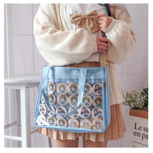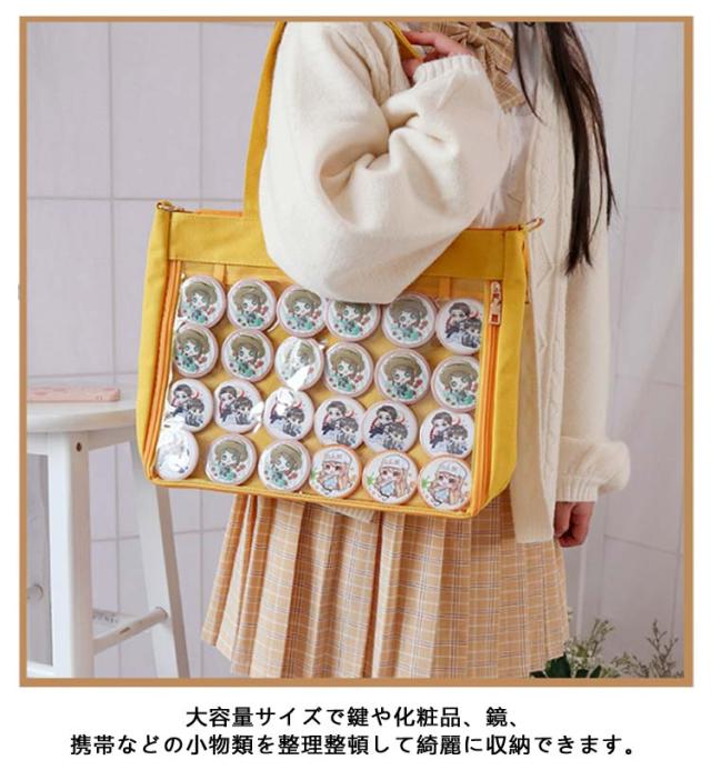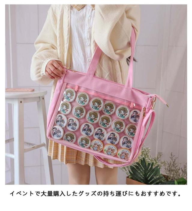 | シンプルで上品なデザインが可愛い痛バッグです。 トート・ショルダー・斜め掛けの3WAYで利用できて使い勝手も抜群です◎ バッグ正面の透明カバーが大きく開くため、自分好みにアレンジし放題です。 大容量サイズで鍵や化粧品、鏡、携帯などの小物類を整理整頓して綺麗に収納できます。 整理することで取りたいものをサッと取れてストレスフリーです♪ イベントで大量購入したグッズの持ち運びにもおすすめです。 | |