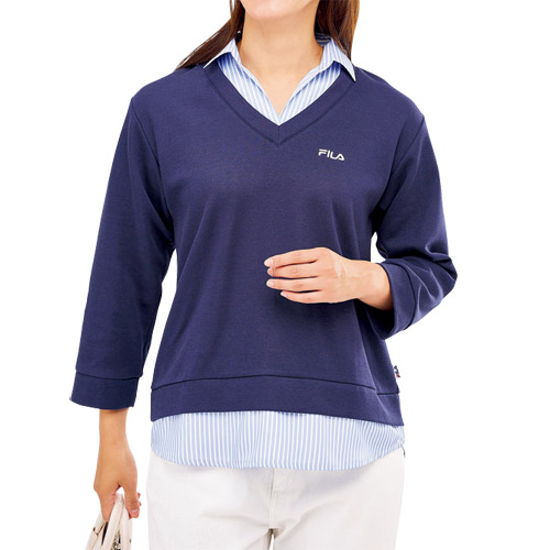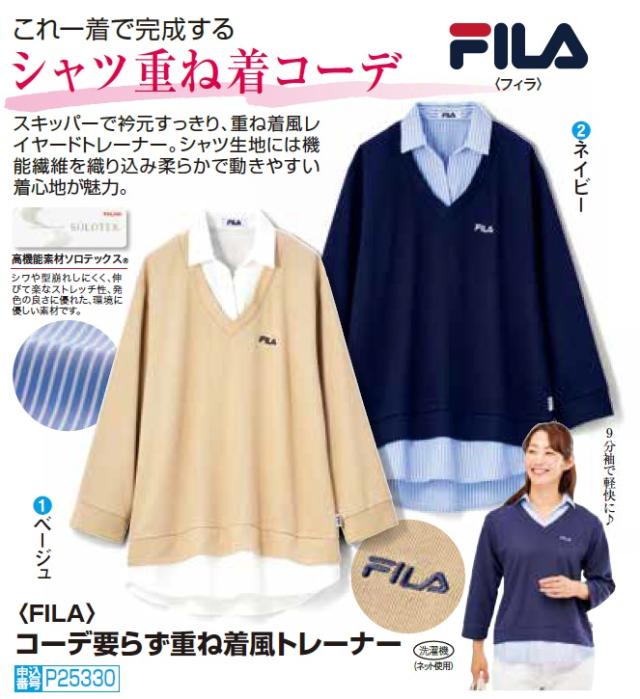 トレーナー 襟付き 重ね着風 レディース フィラ コーデ要らず重ね着風トレーナー 全2色 婦人服 ミセス シニア 女性 ベージュ ネイビー 薄茶色 紺色 シンプル シンプル 無地 ロゴ FILA ファッション 40代 50代 60代 70代 80代 母の日 お母さん 秋物 冬物 秋冬 fri p25330