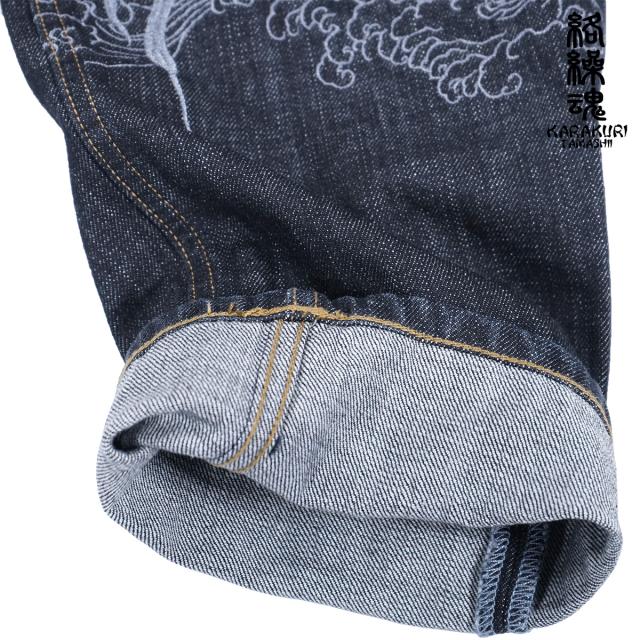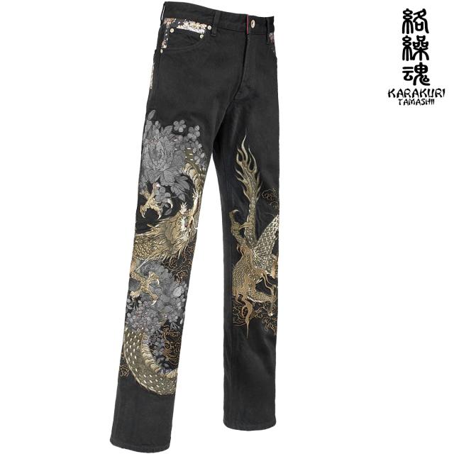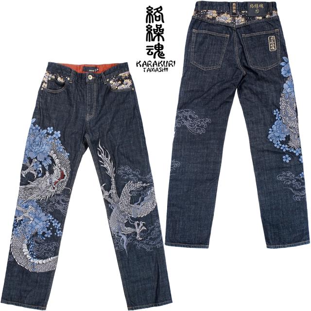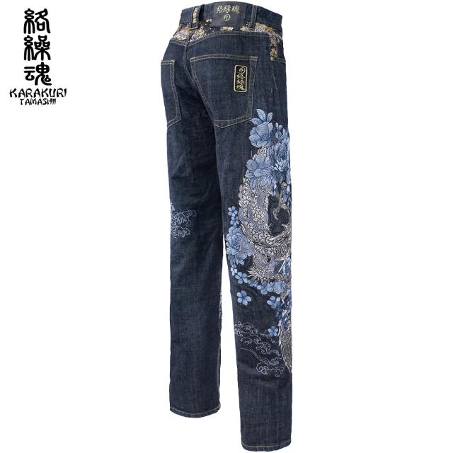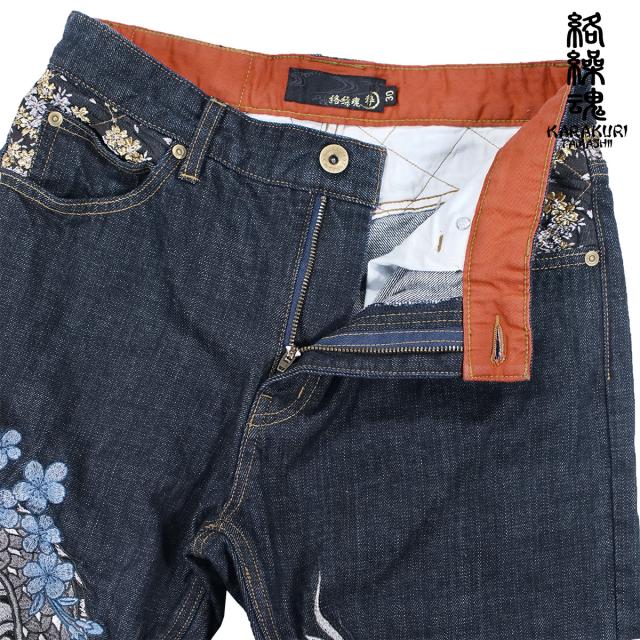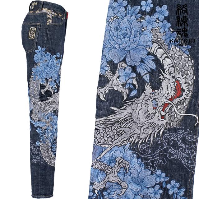 絡繰魂 粋 デニム 龍 和柄 総刺繍 牡丹 メンズ ロングパンツ mens(ネイビー紺) 241230