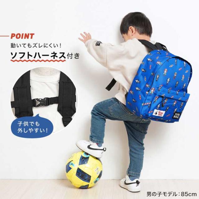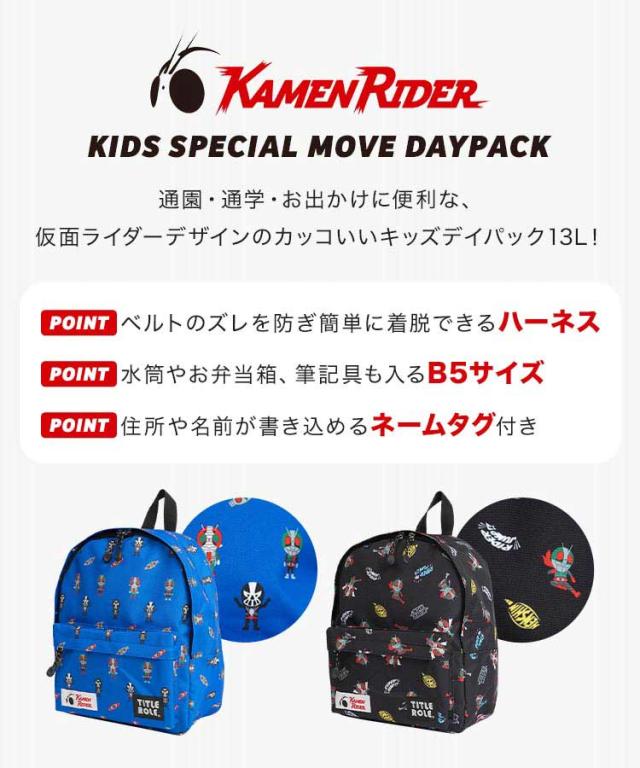 通園・通学・お出かけに便利な、仮面ライダーデザインのカッコいいキッズデイパック13L! 水筒やお弁当箱、筆記具も入るB5サイズ! ベルトのズレを防ぎ簡単に着脱できるハーネスや住所や名前が書き込めるネームタグ付き。