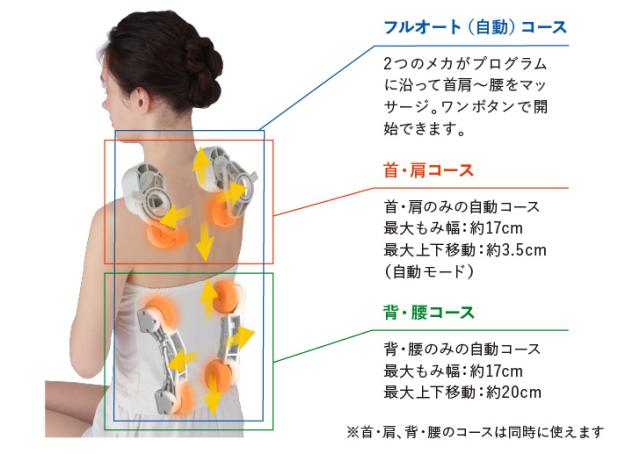 肩〜首に2モーター、腰〜背中に3モーターのダブルメカを搭載。もみ玉にはヒーター内蔵なので、温めながらマッサージできます。多彩な動きで首〜腰をマッサージ
