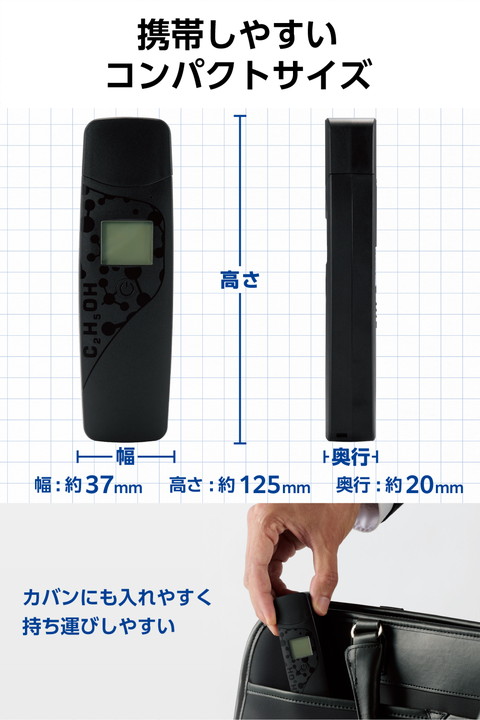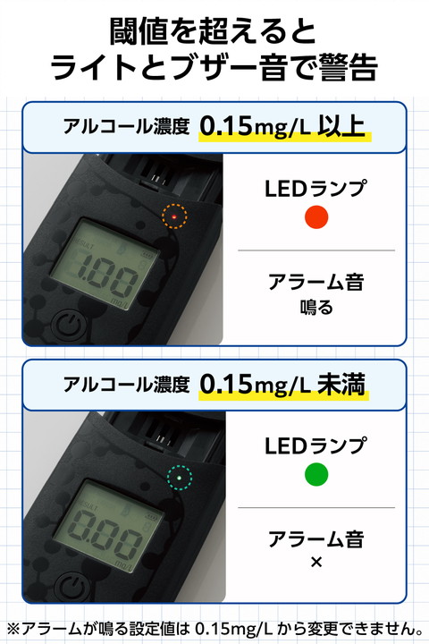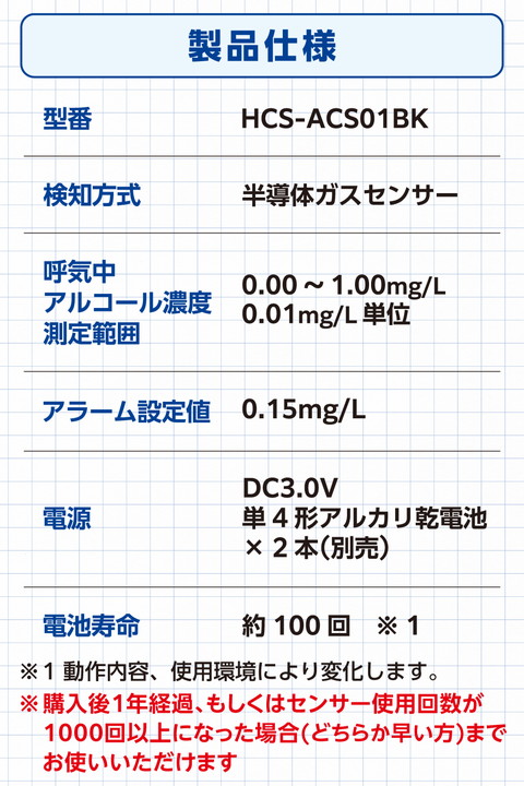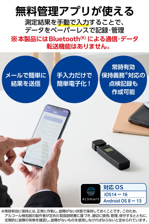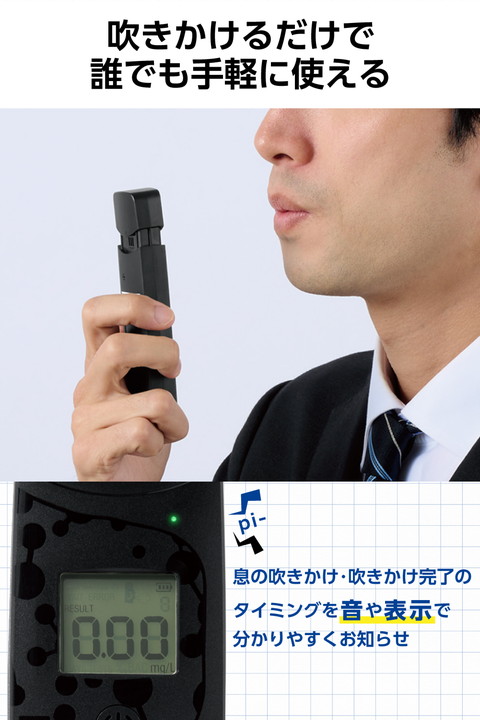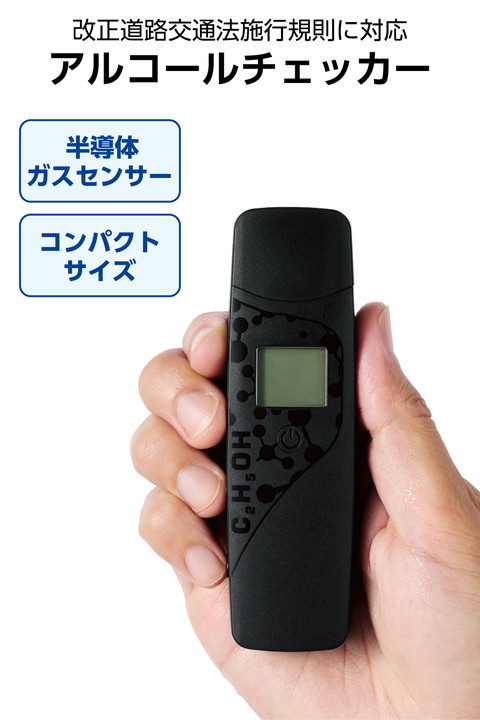 改正道路交通法施行規則に対応したアルコールチェッカーです。息を吹きかけるだけで簡単に呼気中のアルコール濃度を測定可能。携帯・管理しやすいコンパクトサイズで、1人1台の所持にも適しています。スマホアプリ(無料)を活用することで測定結果を記録でき、常時有効保持義務にも対応しています。![]() ■改正道路交通法施行規則に対応した、持ち運びに便利な小型アルコールチェッカーです。 ■※国家公安委員会が定めるアルコール検知器です。 ■片手に収まるコンパクトなサイズで、携帯しても邪魔になりません。 ■センサーに息を吹きかけるだけで、簡単に呼気中のアルコール濃度を測定できます。 ■製品が小型のため感染症対策として1人1台の所持がしやすく、まとめて管理しても場所を取りません。 ■息を吹きかけるタイミングや、吹きかけ完了のタイミングを電子音で分かりやすくお知らせ。操作もシンプルで、誰でも手軽に使用できます。 ■測定時、閾値を超えたアルコールを検出するとLEDライトが赤く光り、ブザー音で警告します。 ■息を吹きかけてから約5秒で検査結果を表示します。 ■※測定時は安全運転管理者と直接対面、または電話などの通話可能なアプリを併用してください。 ■※購入後1年経過、もしくはセンサー使用回数が1000回以上になった場合(どちらか早い方)までお使いいただけます。 ■吹き込み口をホコリから守るカバー付き。センサーを汚れや傷から守ります。 ■本体にはストラップを取り付けられるストラップホール付きです。 ■※ストラップは付属していません。 ■専用アプリ「ALSmart(アルスマート)」に測定結果を手動で入力することで、データをペーパーレスで記録・管理できます。 ■※Bluetooth(R)による通信・データ転送機能はありません。 ■法令で規定された8項目は、アプリの過去記録から検索・抽出ができ、常時有効保持義務に対応した点検記録も作成可能です。 ■アプリをスマートフォンにインストール後、すぐに利用でき、登録費用などはかかりません。 ![]() ■型番:HCS-ACS01BK ■製品タイプ:吹きかけ式 ■検知方式:半導体ガスセンサー ■表示装置:LCD ■電源:単4形アルカリ乾電池×2本 ■電池寿命:約100回 ■センサー寿命:購入後1年経過、またはセンサーの使用回数が1000回を超えた場合(どちらか早い方) ■呼気中アルコール濃度測定範囲:0〜1.00mg/L ■最小表示単位:0.01mg/L ■サイズ:幅約37mm×奥行約20mm×高さ約125mm ■質量:約41g(電池含まず) ■使用環境条件:0〜40℃/80%RH以下(結露なきこと) ■保管環境条件:0〜50℃/90%RH以下(結露なきこと) ■製造国:中国 ■カラー:ブラック ■内容物:本体×1 ■保証期間:購入後1年間または、1000回測定(「CAL」表示)するまで(どちらか早い方) |