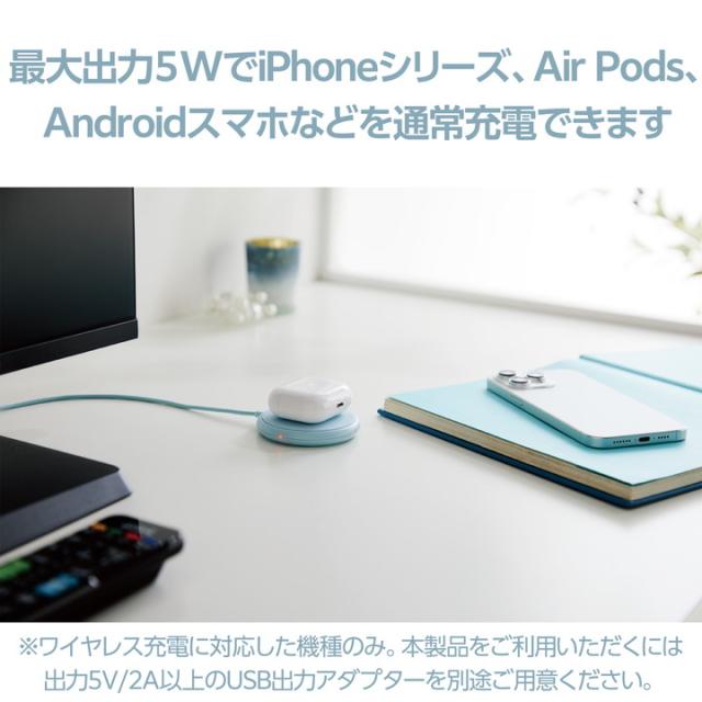 対応スマートフォンを置くだけで充電ができる、Qi規格対応ワイヤレス充電器です。天面に滑り止めパッドを配置し、スマートフォン本体への傷やバイブレーションによる滑り落ちを抑制します。スマートフォンを縦に置いても横に置いてもLEDで動作確認ができます。最大出力は5Wです。