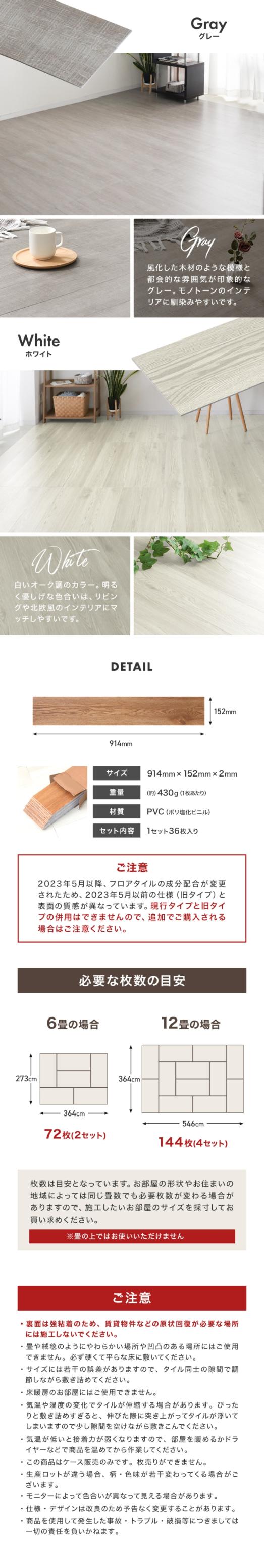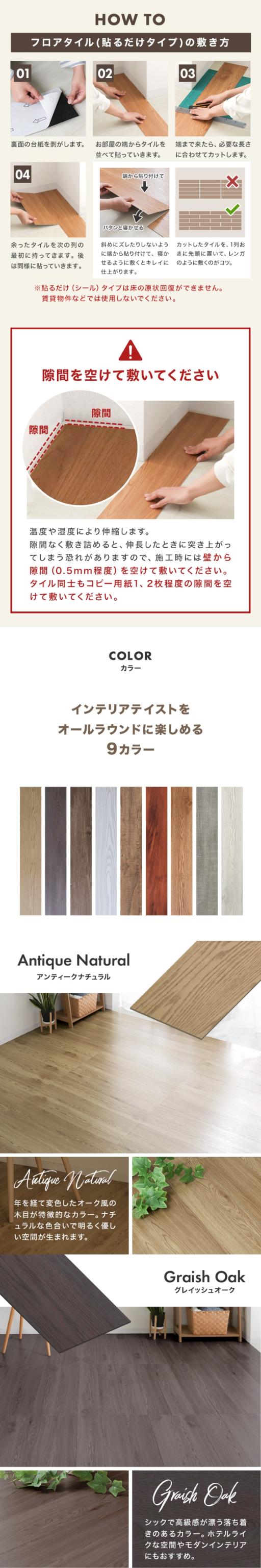 | 注意事項 | ・貼るだけ(シール)タイプは床の現状回復ができません。賃貸物件などでは使用しないでください。 ・畳や絨毯のようにやわらかい場所や凹凸のある場所ではご使用できません。必ず硬くて平らな床の上でご使用ください。 ・サイズには若干の誤差がありますので、タイル同士の隙間で調整しながら敷き詰めてください。 ・床暖房のお部屋にはご使用できません。 ・気温や湿度の変化でタイルが伸縮する場合があります。ぴったりと敷き詰めすぎると、伸びた際に突き合ってタイルが浮き上がってしまいますので少し隙間を開けながら敷きこんでください。 ・気温が低い場合は、接着力が弱くなりますので部屋を温めるかドライヤー等で商品を暖めてから作業してください。 ・この商品はケース販売のみです。 申し訳ございませんが、枚売りが出来ません。 ・生産ロットが違う場合、柄・色味が若干変わってくる場合がございます。 ・商品を使用して発生した事故・トラブル・破損等につきましては一切の責任を負いかねます。 ・商品は、モニターによって色合いが異なって見える場合があります。 ・仕様・デザインは改良のため予告なく変更することがあります。 |