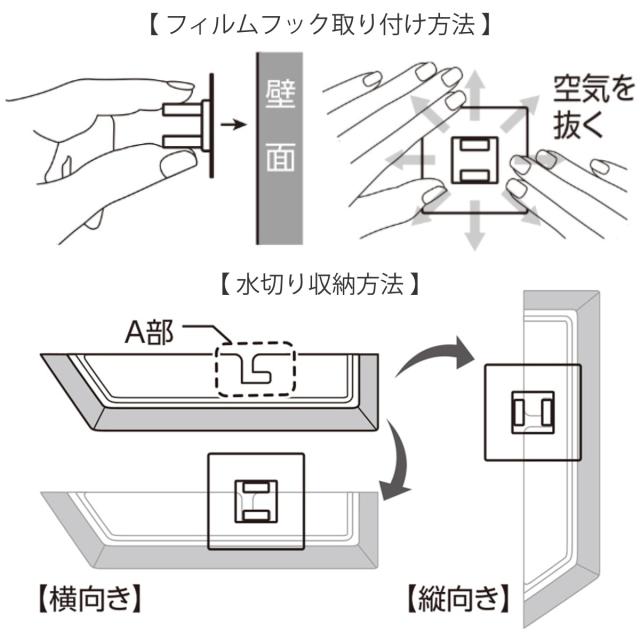 | 材質 | グリップ:ABS樹脂 水切りゴム:合成ゴム フック:ポリスチレン、合成ゴム フィルム:PET、オレフィン系エラストマー |