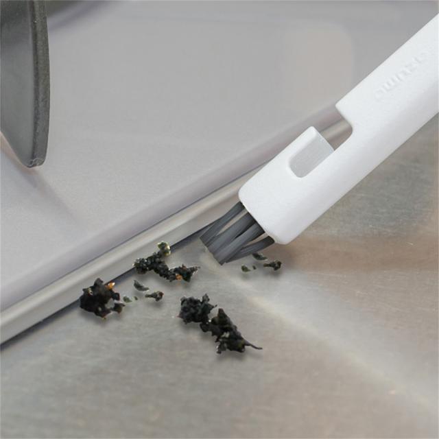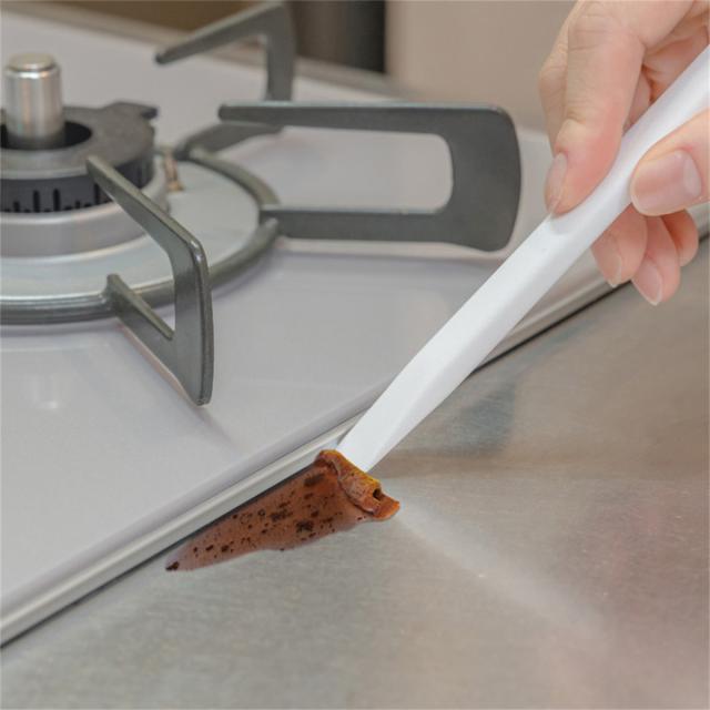 レンジ周りのこびりついた頑固な汚れを、しっかり削ぎ落とすことができます。また反対側にはミニブラシが付いているので、隅に溜まった汚れも掃き出せます。