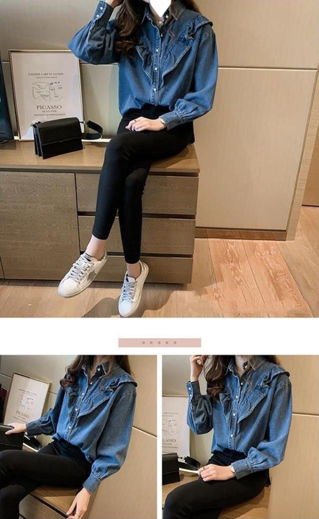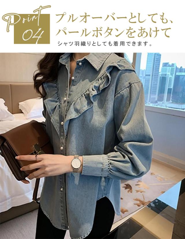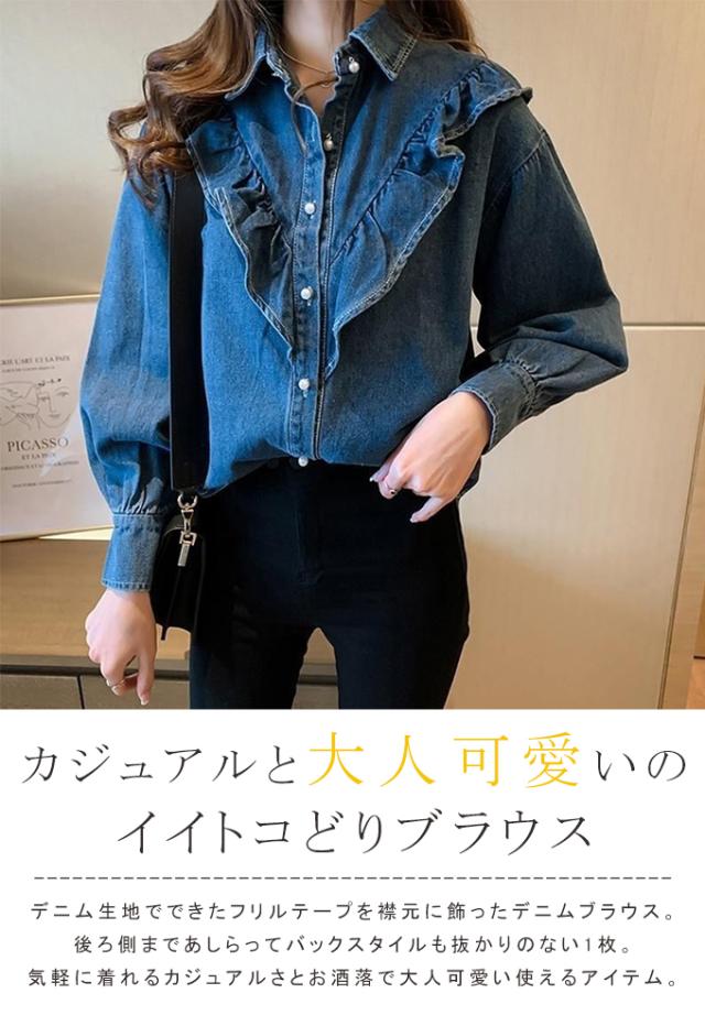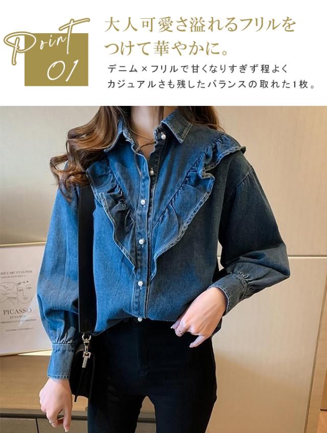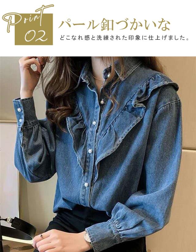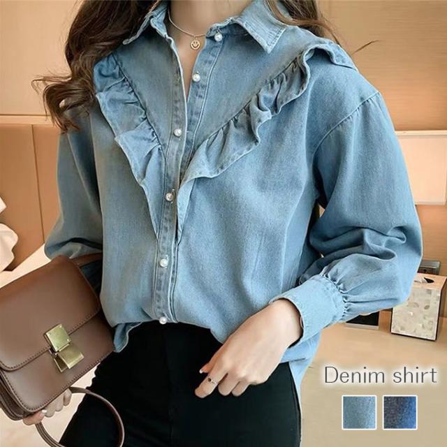 デニムシャツ ブラウス レディース きれいめ 春秋 上品 長袖デニムシャツ トップス シャツ デニム フリル 大人可愛い 韓国風 大きいサイズ カジュアル おでかけ 着まわし レトロ クラシカル 大人 ファッション 20代 30代 40代 M L XL 2XL 3XL 4XL