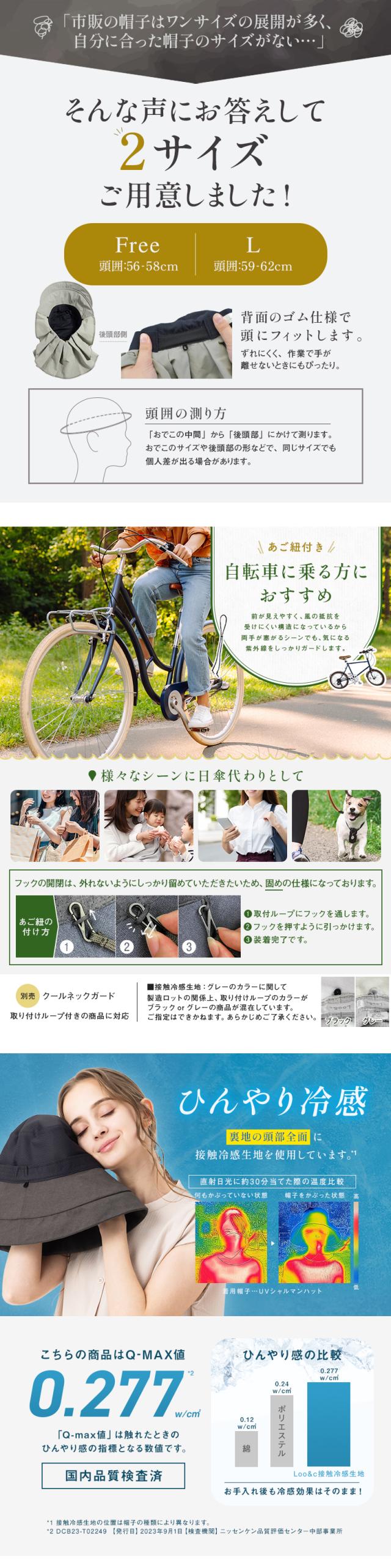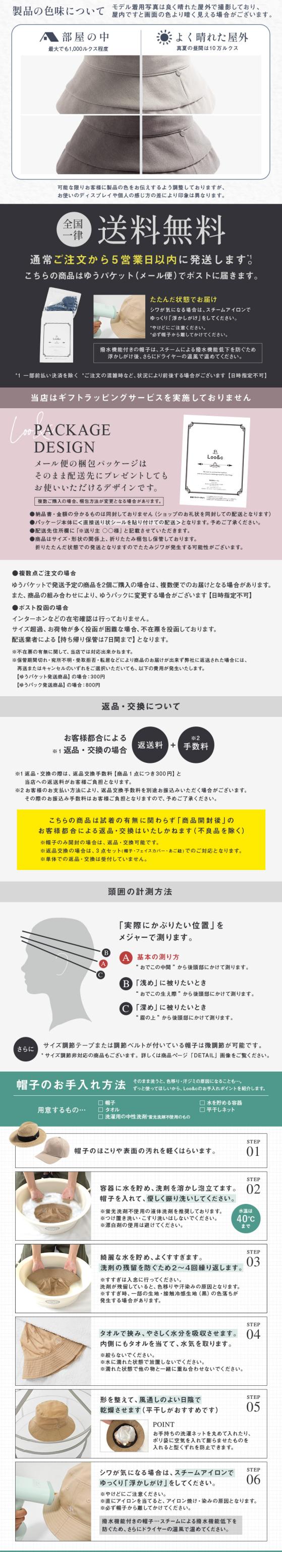 | ・高さはモデル着用時の高さを記載しています。 ・頭囲・高さ・つばのサイズ表記は、5mm前後の誤差が生じる場合があります。計測サイズは目安としてお考えください。 ・遮光生地の厚さには多少の差異があり、中にはシャカシャカと音がする場合があります。 ・お取り扱いの前に品質ネームタグの記載内容をご確認ください。 ・ご覧いただくモニターの発色具合によって実物と色が異なって見える場合があります。 ・商品単体の画像が実際の商品と色合いが近いものとなっておりますので、ご参照ください。 ・同商品でも、染色過程で色味が多少変わる場合があります。 ・背面にゴムを内蔵しているため、手動でのサイズ調節はできません。 ・取り外し可能なあご紐付きです。 ・ルーシーUVフェイスカバー付き(調節式イヤーフックによりサイズ調節が可能です)。 |