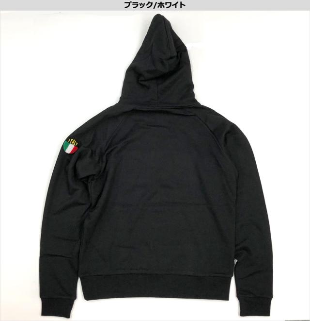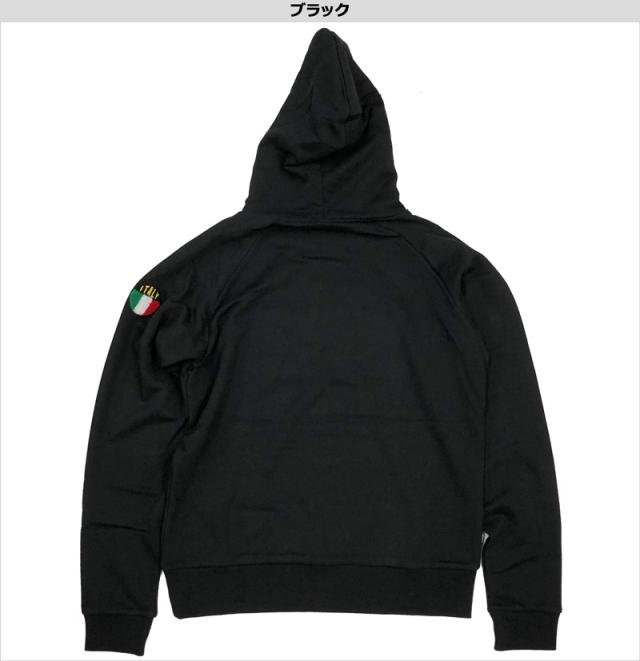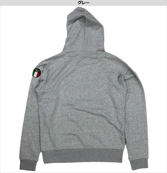 胸にパイル編みの大型ボックスロゴワッペン、左腕にイタリアカラーの丸ワッペンを配置したプルオーバーフーディー