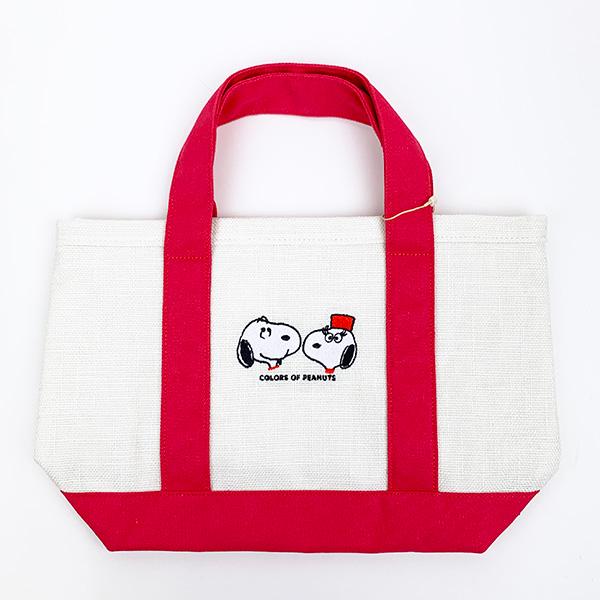 カラフルなカラー展開がかわいいシリーズ!マチ付きのちょうど良いサイズ感のトートバッグです。スヌーピーの刺繍と同色ハンドルがおしゃれ♪お出かけの際のちょっとした手提げバッグとしてとっても重宝しそうです。