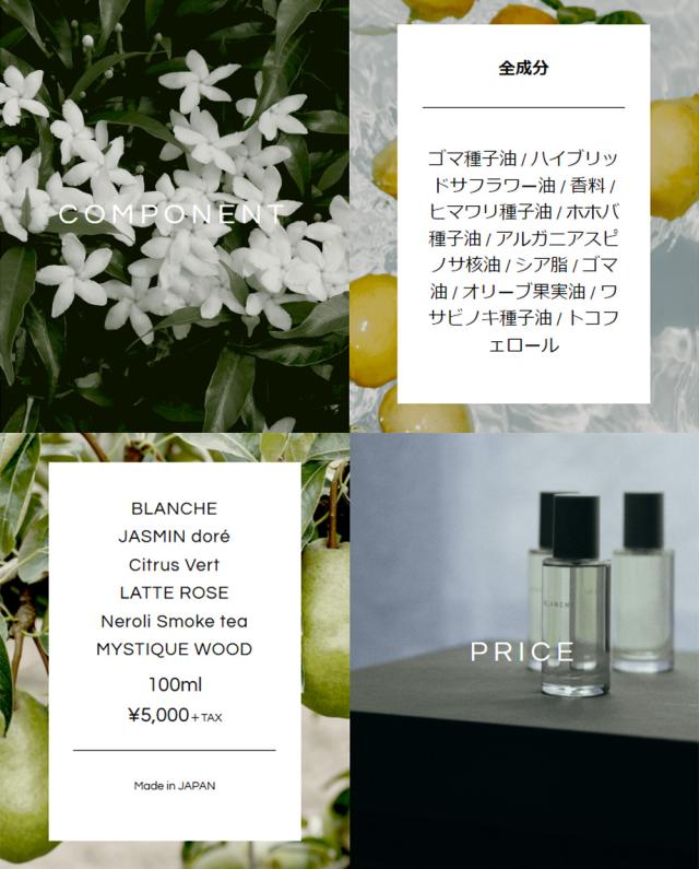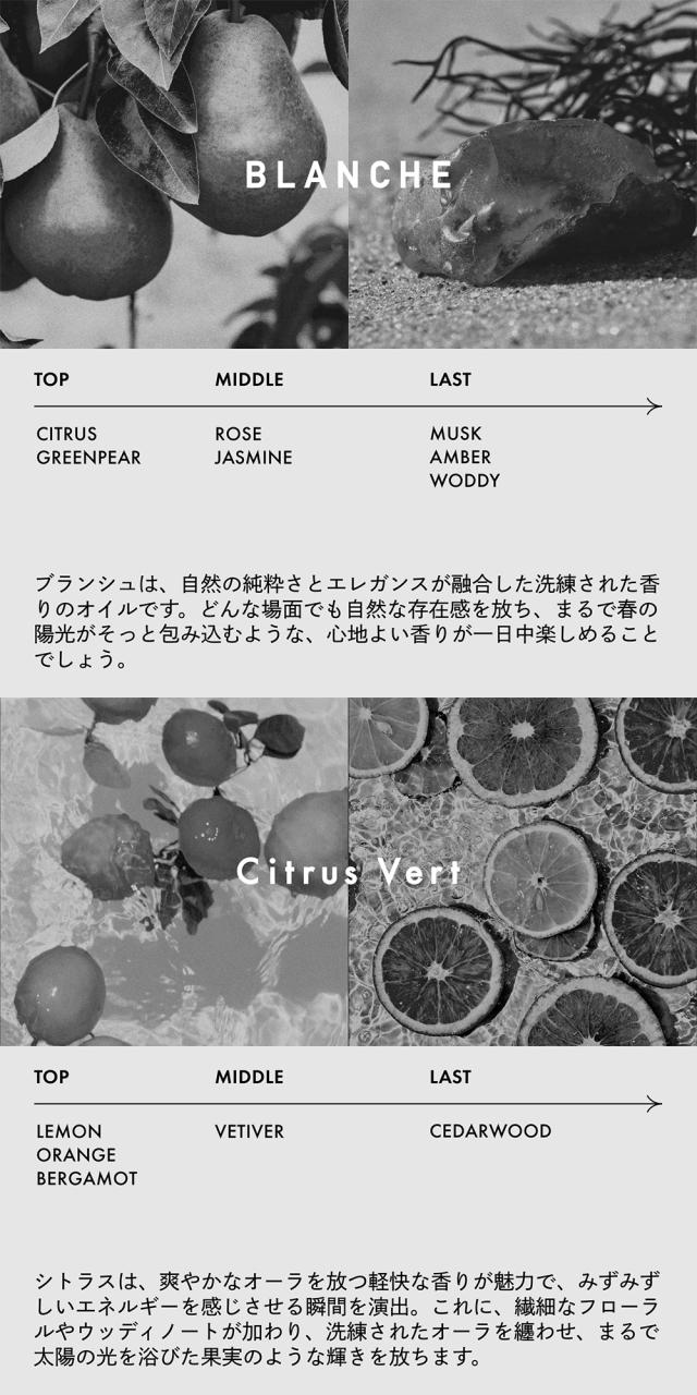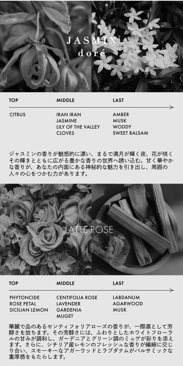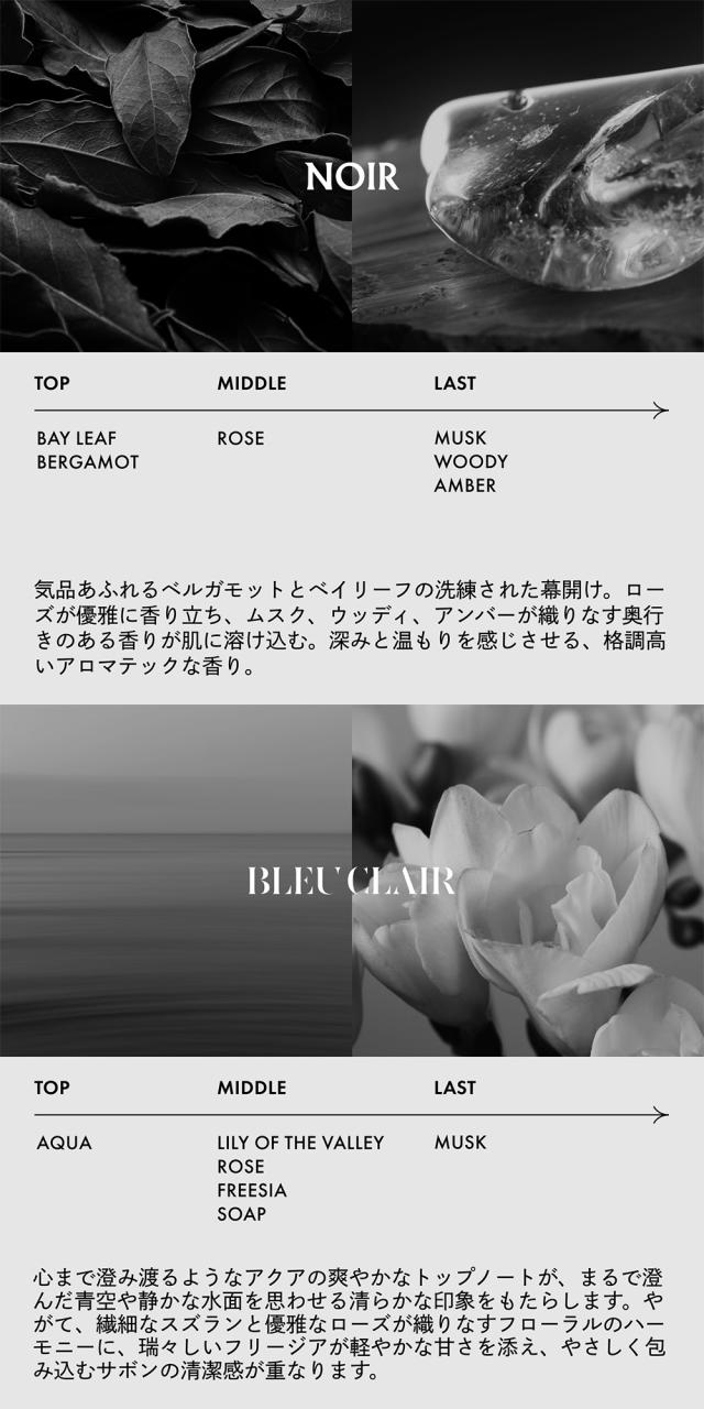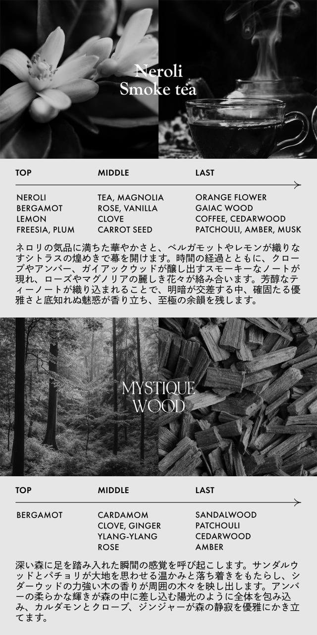 | 香調 | <ブランシュ> トップノート:シトラス・グリーンペアー/ミドルノート:ローズ・ジャスミン/ラストノート:ムスク・アンバー・ウッディ <シトラスベール> トップノート:レモン・オレンジ・ベルガモット/ミドルノート:ベチバー/ラストノート:シダーウッド <ジャスミンドレ> トップノート:シトラス/ミドルノート:イランイラン・ジャスミン・スズラン・クローブ/ラストノート:アンバー・ムスク・ウッディ・バルサム <ラテローズ> トップノート:フィトンチッド・ローズペタル・シシリアンレモン/ミドルノート:センチフォリアローズ・ラベンダー・ガーデニア・ミュゲ/ラストノート:ラブダナム・アガーウッド・ムスク <ネロリスモークティー> トップノート:ネロリ・ベルガモット・レモン・フリージア・プラム/ミドルノート:ティー・マグノリア・バニラ・クローブ・キャロットシード/ラストノート:オレンジフラワー・ガイアックウッド・コーヒー・シダーウッド・パチョリ・アンバー・ムスク <ミスティックウッド> トップノート:ベルガモット/ミドルノート:カルダモン・クローブ・ジンジャー・イランイラン・ローズ/ラストノート:サンダルウッド・パチョリ・シダーウッド・アンバー <ノワール> トップノート:ベイリーフ・ベルガモット/ミドルノート:ローズ/ラストノート:ムスク・ウッディ・アンバー <ブルークレール> トップノート:アクア/ミドルノート:スズラン・ローズ・フリージア・ソープ/ラストノート:ムスク <ペアーブランシュ> トップノート:ペアー/ミドルノート:ローズ・スズラン・フリージア/ラストノート:ムスク・パチョリ |
