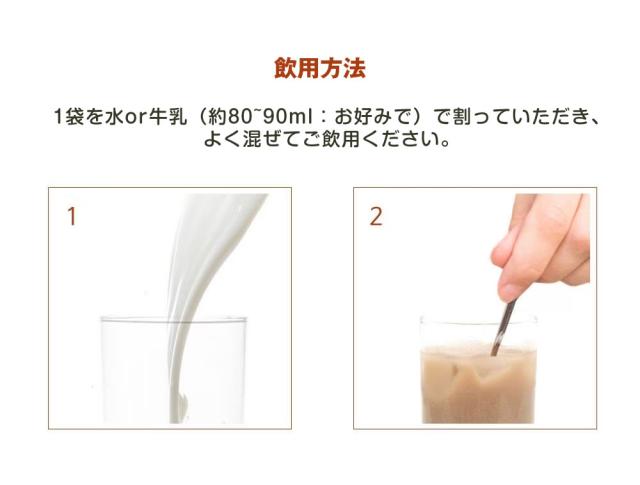 1袋を水or牛乳(約80~90ml:お好みで)で割っていただき、よく混ぜてご飲用ください。