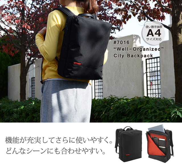 「ウェルオーガナイズド シティーバックパック」は、A4サイズもしっかり入る、軽くて機能的なリュック。外側の素材には840D高密度ナイロン「Super lon」を採用し、さらに撥水加工を施しています。