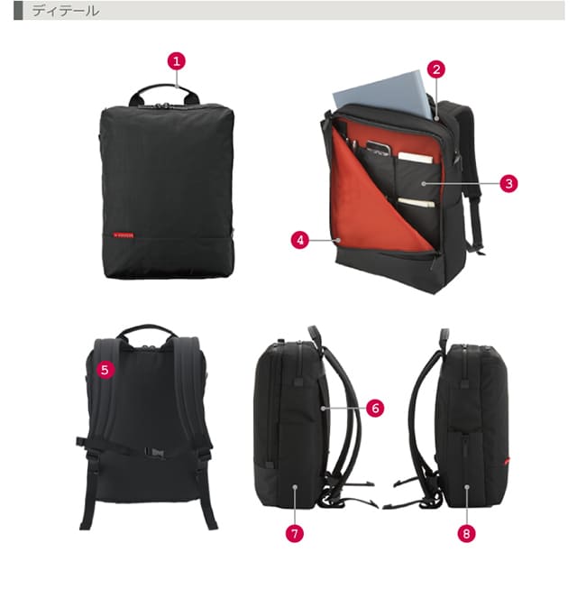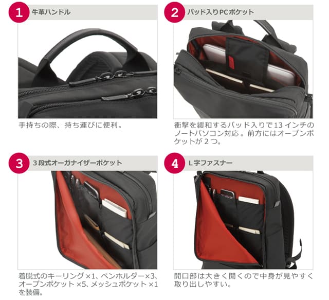 内部の素材には、ブランドのアイコンカラーであるレッドの裏地を取り入れることでデザイン性と視認性を高めています。A4サイズ対応し、パッド入りのPCポケット、3段式オーガナイザーポケット、両アウトサイドポケットや背面ファスナーポケットなど荷物を整理しやすい仕様となっています。
