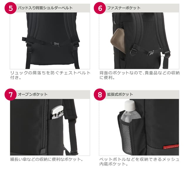 手持ちの際につかみやすい牛革ハンドルや、パッド入りの背面ショルダーベルト、肩落ちを防ぐチェストベルトなど長時間でも持ちやすい工夫もされています。ビジネスにもカジュアルにも男女問わず幅広く使えるデザインです。