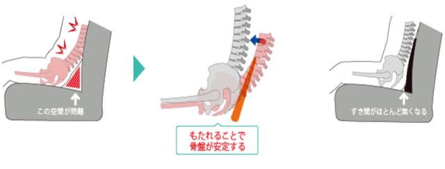 そのような状態を防ぐ為にクッションには前傾6度という角度をつけました。前傾6度が仙骨を中心に背骨が立っている時と同じ背骨の状態に近づけるのです。
