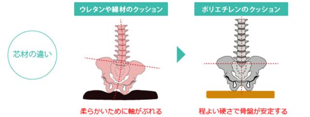 そこで発泡ポリエチレンという適度な硬さのある素材を使用。硬さだけでなく、元の形に戻る復元性も高いため、発泡ポリエチレンを使ったクッションだと骨盤が沈み、軸がぶれるのを抑えます。この適度な硬さが骨盤を安定させて座ることができます。
