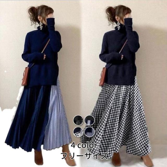 ニット トップス セットアップ ハイネック レディース ロング丈 プリーツスカート 秋 冬 バイカラー 長袖 体型カバー 秋冬 上品 通勤 OL