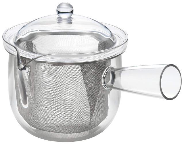 割れにくく使いやすい、ガラスみたいなプラスチック製の急須です。 透明なので、お茶の出具合がよく見えます。 網目の細かいステンレス製ストレーナータイプ。 注ぎ口は水切れが良く、注ぎやすさ抜群です。 二人分にピッタリサイズ。
