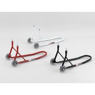 世界中のほとんどのオートバイをリフトアップさせてしまう、いわば、スーパーフロントスタンド。左右のフロントフォークの底部に8mm以上の穴があいていればOK。特に、YZF-R1等最新型のビッグバイクで、フロントフォークの最低地上高が左右で異なる車両に威力を発揮します。もちろん、フロントタイヤの脱着もスピーディー。走行前のタイヤウォーマー装着や、簡単な整備・洗車等に威力を発揮します。左右の幅調整は無段階・左右とも独立して高さ調整も無段階です。(実用新案登録 第3074529号)